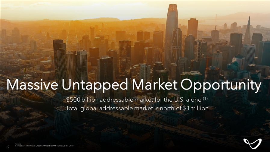 Massive Untapped Market Opportunity (1) $500 billion addressable market for the U.S. alone Total global addressable market is north of $1 trillion No tes: 1. Booz Allen Hamilton: Urban Air Mobility (UAM) Market Study – 2018 10Massive Untapped Market Opportunity (1) $500 billion addressable market for the U.S. alone Total global addressable market is north of $1 trillion No tes: 1. Booz Allen Hamilton: Urban Air Mobility (UAM) Market Study – 2018 10