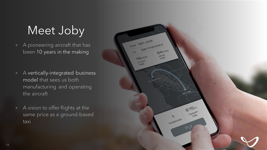 Meet Joby + A pioneering aircraft that has been 10 years in the making + A vertically-integrated business model that sees us both manufacturing and operating the aircraft + A vision to offer flights at the same price as a ground-based taxi 11Meet Joby + A pioneering aircraft that has been 10 years in the making + A vertically-integrated business model that sees us both manufacturing and operating the aircraft + A vision to offer flights at the same price as a ground-based taxi 11