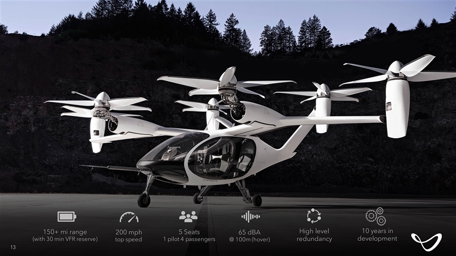 2020 Received certification basis Aircraft design lock 2021 Anticipated timeline Certification component level testing to certification and commercialization FAA certification flight test 2022 Ahead of the Demonstration service in select markets competition Mass production facility comes online 2023 FAA Type Certification issued Commercial service launch in initial markets 2024 Global commercial service launched 242020 Received certification basis Aircraft design lock 2021 Anticipated timeline Certification component level testing to certification and commercialization FAA certification flight test 2022 Ahead of the Demonstration service in select markets competition Mass production facility comes online 2023 FAA Type Certification issued Commercial service launch in initial markets 2024 Global commercial service launched 24