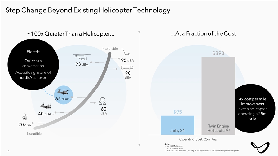 Step Change Beyond Existing Helicopter Technology ...At a Fraction of the Cost ~100x Quieter Than a Helicopter... Intolerable Electric $393 95 dBA Quiet as a 93 dBA conversation Acoustic signature of 90 dBA 65dBA at hover (1) 65 dBA 4x cost per mile improvement over a helicopter 60 $95 (2) dBA operating a 25mi 40 dBA trip 20 dBA Twin Engine (3) Joby S4 Helicopter Inaudible Operating Cost: 25mi trip No tes: 1. At 100M distance 2. At 500M distance 3. AircraftCostCalculator (Sikorsky S-76C+) – Based on 120mph helicopter block speed 14Step Change Beyond Existing Helicopter Technology ...At a Fraction of the Cost ~100x Quieter Than a Helicopter... Intolerable Electric $393 95 dBA Quiet as a 93 dBA conversation Acoustic signature of 90 dBA 65dBA at hover (1) 65 dBA 4x cost per mile improvement over a helicopter 60 $95 (2) dBA operating a 25mi 40 dBA trip 20 dBA Twin Engine (3) Joby S4 Helicopter Inaudible Operating Cost: 25mi trip No tes: 1. At 100M distance 2. At 500M distance 3. AircraftCostCalculator (Sikorsky S-76C+) – Based on 120mph helicopter block speed 14