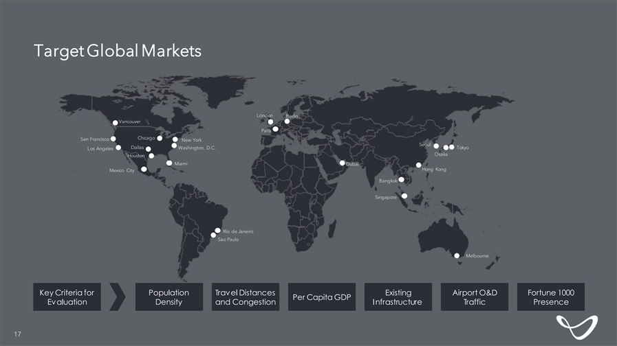 Target Global Markets London Berlin Vancouver Paris Chicago San Francisco New York Seoul Dallas Tokyo Washington, D.C. Los Angeles Osaka Houston Miami Dubai Hong Kong Mexico City Bangkok Singapore Rio de Janeiro Sao Paulo Melbourne Key Criteria for Population Travel Distances Existing Airport O&D Fortune 1000 Per Capita GDP Evaluation Density and Congestion Infrastructure Traffic Presence 17Target Global Markets London Berlin Vancouver Paris Chicago San Francisco New York Seoul Dallas Tokyo Washington, D.C. Los Angeles Osaka Houston Miami Dubai Hong Kong Mexico City Bangkok Singapore Rio de Janeiro Sao Paulo Melbourne Key Criteria for Population Travel Distances Existing Airport O&D Fortune 1000 Per Capita GDP Evaluation Density and Congestion Infrastructure Traffic Presence 17