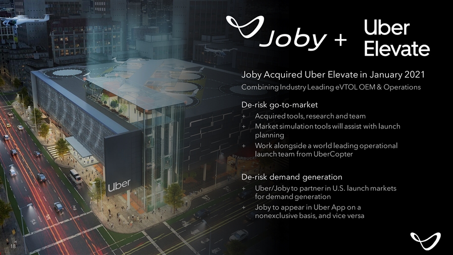 + Joby Acquired Uber Elevate in January 2021 Combining Industry Leading eVTOL OEM & Operations De-risk go-to-market + Acquired tools, research and team + Market simulation tools will assist with launch planning + Work alongside a world leading operational launch team from UberCopter De-risk demand generation + Uber/Joby to partner in U.S. launch markets for demand generation + Joby to appear in Uber App on a nonexclusive basis, and vice versa 18+ Joby Acquired Uber Elevate in January 2021 Combining Industry Leading eVTOL OEM & Operations De-risk go-to-market + Acquired tools, research and team + Market simulation tools will assist with launch planning + Work alongside a world leading operational launch team from UberCopter De-risk demand generation + Uber/Joby to partner in U.S. launch markets for demand generation + Joby to appear in Uber App on a nonexclusive basis, and vice versa 18