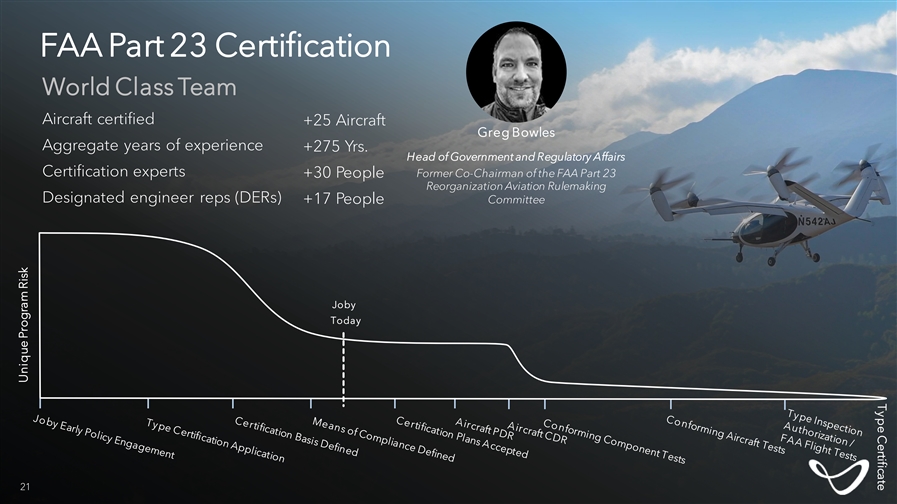 Type Certificate FAA Part 23 Certification World Class Team Aircraft certified +25 Aircraft Greg Bowles Aggregate years of experience +275 Yrs. Head of Government and Regulatory Affairs Certification experts Former Co-Chairman of the FAA Part 23 +30 People Reorganization Aviation Rulemaking Designated engineer reps (DERs) Committee +17 People Joby Today 21 Unique Program RiskType Certificate FAA Part 23 Certification World Class Team Aircraft certified +25 Aircraft Greg Bowles Aggregate years of experience +275 Yrs. Head of Government and Regulatory Affairs Certification experts Former Co-Chairman of the FAA Part 23 +30 People Reorganization Aviation Rulemaking Designated engineer reps (DERs) Committee +17 People Joby Today 21 Unique Program Risk