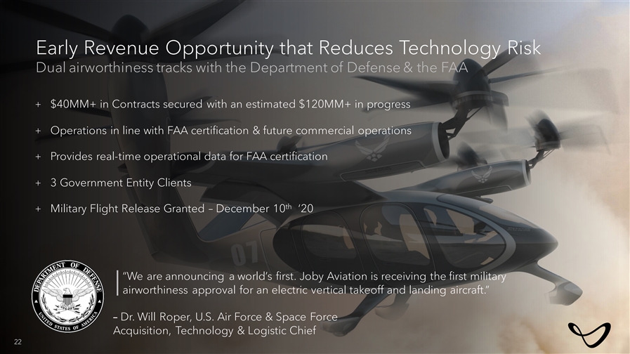 Early Revenue Opportunity that Reduces Technology Risk Dual airworthiness tracks with the Department of Defense & the FAA + $40MM+ in Contracts secured with an estimated $120MM+ in progress + Operations in line with FAA certification & future commercial operations + Provides real-time operational data for FAA certification + 3 Government Entity Clients th + Military Flight Release Granted – December 10 ‘20 “We are announcing a world’s first. Joby Aviation is receiving the first military airworthiness approval for an electric vertical takeoff and landing aircraft.” – Dr. Will Roper, U.S. Air Force & Space Force Acquisition, Technology & Logistic Chief 22Early Revenue Opportunity that Reduces Technology Risk Dual airworthiness tracks with the Department of Defense & the FAA + $40MM+ in Contracts secured with an estimated $120MM+ in progress + Operations in line with FAA certification & future commercial operations + Provides real-time operational data for FAA certification + 3 Government Entity Clients th + Military Flight Release Granted – December 10 ‘20 “We are announcing a world’s first. Joby Aviation is receiving the first military airworthiness approval for an electric vertical takeoff and landing aircraft.” – Dr. Will Roper, U.S. Air Force & Space Force Acquisition, Technology & Logistic Chief 22