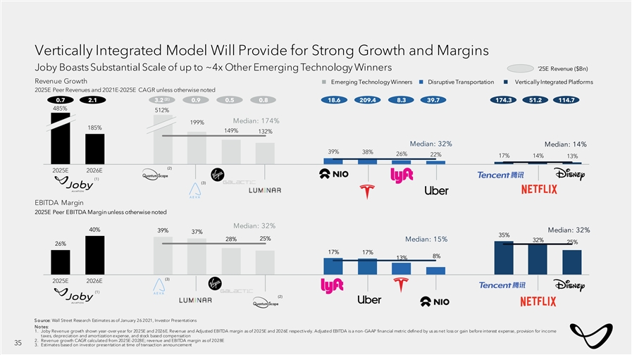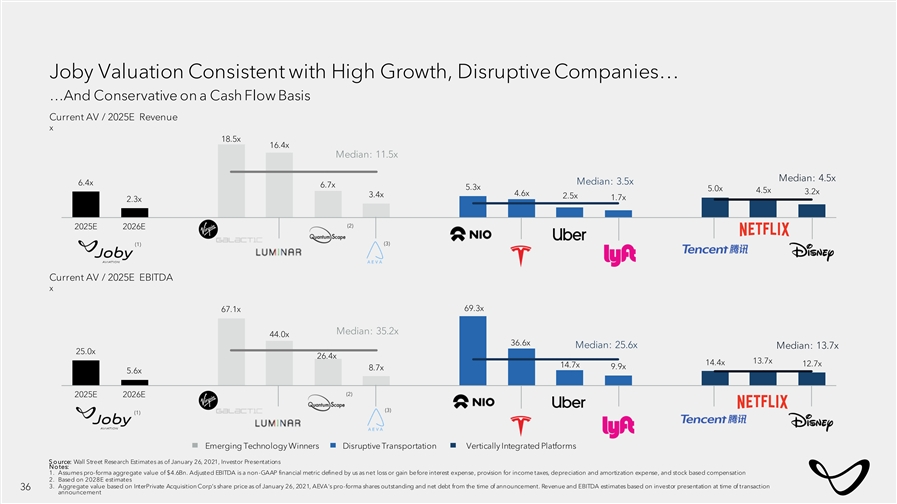 Vertically Integrated Model Will Provide for Strong Growth and Margins Joby Boasts Substantial Scale of up to ~4x Other Emerging Technology Winners ’25E Revenue ($Bn) Revenue Growth Emerging Technology Winners Disruptive Transportation Vertically Integrated Platforms 2025E Peer Revenues and 2021E-2025E CAGR unless otherwise noted (2) 0.7 2.1 3.2 0.9 0.5 0.8 18.6 209.4 8.3 39.7 174.3 51.2 114.7 485% 512% Median: 174% 199% 185% 149% 132% Median: 32% Median: 14% 39% 38% 26% 22% 17% 14% 13% (2) 2025E 2026E (1) (3) EBITDA Margin 2025E Peer EBITDA Margin unless otherwise noted Median: 32% 40% 39% Median: 32% 37% 35% 28% 25% Median: 15% 32% 25% 26% 17% 17% 8% 13% (3) 2025E 2026E (1) (2) S o urce: Wall Street Research Estimates as of January 26 2021, Investor Presentations No tes: 1. Joby Revenue growth shown year-over-year for 2025E and 2026E. Revenue and Adjusted EBITDA margin as of 2025E and 2026E respectively. Adjusted EBITDA is a non-GAAP financial metric defined by us as net loss or gain before interest expense, provision for income taxes, depreciation and amortization expense, and stock based compensation 2. Revenue growth CAGR calculated from 2025E-2028E; revenue and EBITDA margin as of 2028E 35 3. Estimates based on investor presentation at time of transaction announcementVertically Integrated Model Will Provide for Strong Growth and Margins Joby Boasts Substantial Scale of up to ~4x Other Emerging Technology Winners ’25E Revenue ($Bn) Revenue Growth Emerging Technology Winners Disruptive Transportation Vertically Integrated Platforms 2025E Peer Revenues and 2021E-2025E CAGR unless otherwise noted (2) 0.7 2.1 3.2 0.9 0.5 0.8 18.6 209.4 8.3 39.7 174.3 51.2 114.7 485% 512% Median: 174% 199% 185% 149% 132% Median: 32% Median: 14% 39% 38% 26% 22% 17% 14% 13% (2) 2025E 2026E (1) (3) EBITDA Margin 2025E Peer EBITDA Margin unless otherwise noted Median: 32% 40% 39% Median: 32% 37% 35% 28% 25% Median: 15% 32% 25% 26% 17% 17% 8% 13% (3) 2025E 2026E (1) (2) S o urce: Wall Street Research Estimates as of January 26 2021, Investor Presentations No tes: 1. Joby Revenue growth shown year-over-year for 2025E and 2026E. Revenue and Adjusted EBITDA margin as of 2025E and 2026E respectively. Adjusted EBITDA is a non-GAAP financial metric defined by us as net loss or gain before interest expense, provision for income taxes, depreciation and amortization expense, and stock based compensation 2. Revenue growth CAGR calculated from 2025E-2028E; revenue and EBITDA margin as of 2028E 35 3. Estimates based on investor presentation at time of transaction announcement