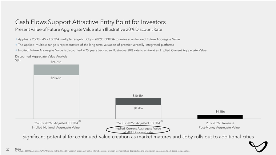 Cash Flows Support Attractive Entry Point for Investors Present Value of Future Aggregate Value at an Illustrative 20% Discount Rate + Applies a 25-30x AV / EBITDA multiple range to Joby’s 2026E EBITDA to arrive at an Implied Future Aggregate Value + The applied multiple range is representative of the long-term valuation of premier vertically integrated platforms + Implied Future Aggregate Value is discounted 4.75 years back at an illustrative 20% rate to arrive at an Implied Current Aggr egate Value Discounted Aggregate Value Analysis $Bn $24.7Bn $20.6Bn $10.4Bn $8.7Bn $4.6Bn (1) (1) 25-30x 2026E Adjusted EBITDA 25-30x 2026E Adjusted EBITDA 2.3x 2026E Revenue Implied Notional Aggregate Value Post-Money Aggregate Value Implied Current Aggregate Value at 20% Discount Rate Significant potential for continued value creation as market matures and Joby rolls out to additional cities No tes: 37 1. Adjusted EBITDA is a non-GAAP financial metric defined by us as net loss or gain before interest expense, provision for income t axes, depreciation and amortization expense, and stock-based compensationCash Flows Support Attractive Entry Point for Investors Present Value of Future Aggregate Value at an Illustrative 20% Discount Rate + Applies a 25-30x AV / EBITDA multiple range to Joby’s 2026E EBITDA to arrive at an Implied Future Aggregate Value + The applied multiple range is representative of the long-term valuation of premier vertically integrated platforms + Implied Future Aggregate Value is discounted 4.75 years back at an illustrative 20% rate to arrive at an Implied Current Aggr egate Value Discounted Aggregate Value Analysis $Bn $24.7Bn $20.6Bn $10.4Bn $8.7Bn $4.6Bn (1) (1) 25-30x 2026E Adjusted EBITDA 25-30x 2026E Adjusted EBITDA 2.3x 2026E Revenue Implied Notional Aggregate Value Post-Money Aggregate Value Implied Current Aggregate Value at 20% Discount Rate Significant potential for continued value creation as market matures and Joby rolls out to additional cities No tes: 37 1. Adjusted EBITDA is a non-GAAP financial metric defined by us as net loss or gain before interest expense, provision for income t axes, depreciation and amortization expense, and stock-based compensation