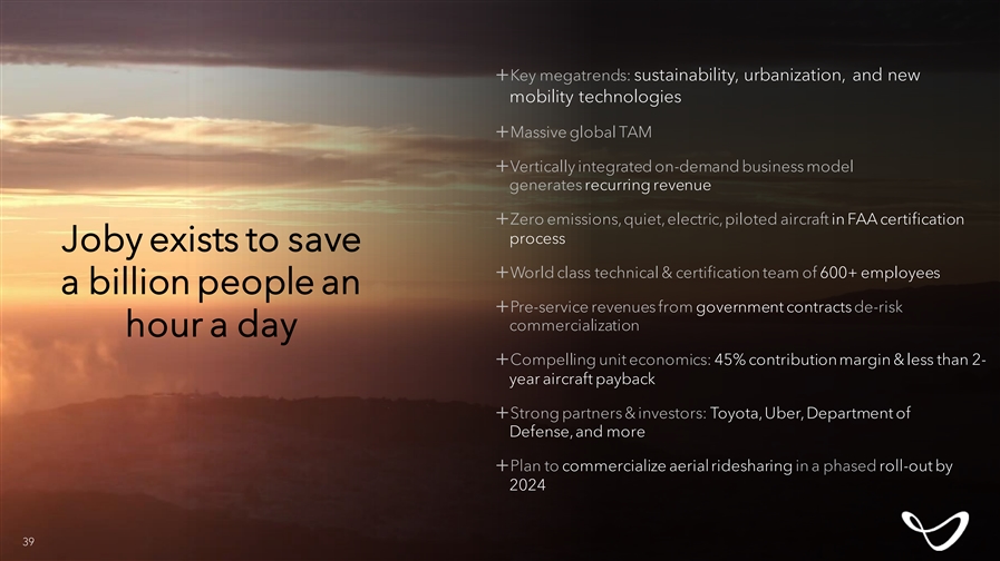 +Key megatrends: sustainability, urbanization, and new mobility technologies +Massive global TAM +Vertically integrated on-demand business model generates recurring revenue +Zero emissions, quiet, electric, piloted aircraft in FAA certification process Joby exists to save +World class technical & certification team of 600+ employees a billion people an +Pre-service revenues from government contracts de-risk commercialization hour a day +Compelling unit economics: 45% contributionmargin & less than 2- year aircraft payback +Strong partners & investors: Toyota, Uber,Department of Defense,and more +Plan to commercialize aerial ridesharing in a phased roll-out by 2024 39+Key megatrends: sustainability, urbanization, and new mobility technologies +Massive global TAM +Vertically integrated on-demand business model generates recurring revenue +Zero emissions, quiet, electric, piloted aircraft in FAA certification process Joby exists to save +World class technical & certification team of 600+ employees a billion people an +Pre-service revenues from government contracts de-risk commercialization hour a day +Compelling unit economics: 45% contributionmargin & less than 2- year aircraft payback +Strong partners & investors: Toyota, Uber,Department of Defense,and more +Plan to commercialize aerial ridesharing in a phased roll-out by 2024 39