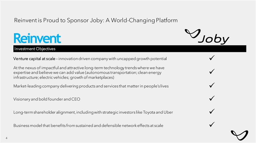 Today's Presenters JoeBen Bevirt Paul Sciarra Michael Thompson CEO & Chief Architect Executive Chairman CEO & CFO Joby Joby Reinvent Serial Entrepenuer with Lifelong Passion for Co-Founder of Pinterest Founder / Portfolio Manager of BHR Aviation and Engineering Entrepreneur-in-Residence at Andreessen Capital Co-Founder of Velocity11 Horowitz 3Today's Presenters JoeBen Bevirt Paul Sciarra Michael Thompson CEO & Chief Architect Executive Chairman CEO & CFO Joby Joby Reinvent Serial Entrepenuer with Lifelong Passion for Co-Founder of Pinterest Founder / Portfolio Manager of BHR Aviation and Engineering Entrepreneur-in-Residence at Andreessen Capital Co-Founder of Velocity11 Horowitz 3