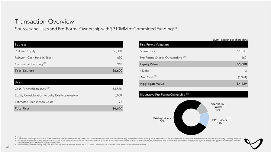 Transaction Overview (1) Sources and Uses and Pro-Forma Ownership with $910MM of Committed Funding $MM, except per share data Sources Pro-Forma Valuation Rollover Equity $5,000 Share Price $10.00 (2) Reinvent Cash Held in Trust 690 Pro-Forma Shares Outstanding 660 (1) Committed Funding 910 Equity Value $6,600 Total Sources $6,600 + Debt 3 (3) - Net Cash (1,974) Uses Aggregate Value $4,629 (2) Cash Proceeds to Joby $1,528 (2) Illustrative Pro-Forma Ownership Equity Consideration to Joby Existing Investors 5,000 Estimated Transaction Costs 72 SPAC Public Holders Total Uses $6,600 10% (1) Existing Holders PIPE Holders 76% 14% No tes: 1. Committed Funding is inclusive of an $835MM fully committed PIPE and a $75MM Uber convertible note which converts immediately prior to transaction closing; the 7.5MM shares to be issued to Uber are excluded from the Equity Consideration to Joby's Existing Investors 2. Pro-forma shares outstanding based on $10.00 per share price and excludes potential dilution from out-of-the-money Reinvent warrants and out-of-of the-money founder shares. Pro-forma further assumes no redemptions by Reinvent's existing public shareholders. Private warrants restructured to match public warrant terms 3. Includes $446MM of existing Joby cash and cash equivalents as of December 31, 2020 and $1,528MM of net proceeds to be added t o Joby's balance sheet 33Transaction Overview (1) Sources and Uses and Pro-Forma Ownership with $910MM of Committed Funding $MM, except per share data Sources Pro-Forma Valuation Rollover Equity $5,000 Share Price $10.00 (2) Reinvent Cash Held in Trust 690 Pro-Forma Shares Outstanding 660 (1) Committed Funding 910 Equity Value $6,600 Total Sources $6,600 + Debt 3 (3) - Net Cash (1,974) Uses Aggregate Value $4,629 (2) Cash Proceeds to Joby $1,528 (2) Illustrative Pro-Forma Ownership Equity Consideration to Joby Existing Investors 5,000 Estimated Transaction Costs 72 SPAC Public Holders Total Uses $6,600 10% (1) Existing Holders PIPE Holders 76% 14% No tes: 1. Committed Funding is inclusive of an $835MM fully committed PIPE and a $75MM Uber convertible note which converts immediately prior to transaction closing; the 7.5MM shares to be issued to Uber are excluded from the Equity Consideration to Joby's Existing Investors 2. Pro-forma shares outstanding based on $10.00 per share price and excludes potential dilution from out-of-the-money Reinvent warrants and out-of-of the-money founder shares. Pro-forma further assumes no redemptions by Reinvent's existing public shareholders. Private warrants restructured to match public warrant terms 3. Includes $446MM of existing Joby cash and cash equivalents as of December 31, 2020 and $1,528MM of net proceeds to be added t o Joby's balance sheet 33