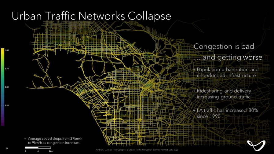 Urban Traffic Networks Collapse Congestion is bad … and getting worse + Population urbanization and underfunded infrastructure + Ridesharing and delivery increasing ground traffic + LA traffic has increased 80% since 1990 + Average speed drops from 37km/h to 9km/h as congestion increases 9 Ambühl, L., et al. “The Collapse of Urban Traffic Networks.” Berkley Hemnet Lab, 2020Urban Traffic Networks Collapse Congestion is bad … and getting worse + Population urbanization and underfunded infrastructure + Ridesharing and delivery increasing ground traffic + LA traffic has increased 80% since 1990 + Average speed drops from 37km/h to 9km/h as congestion increases 9 Ambühl, L., et al. “The Collapse of Urban Traffic Networks.” Berkley Hemnet Lab, 2020
