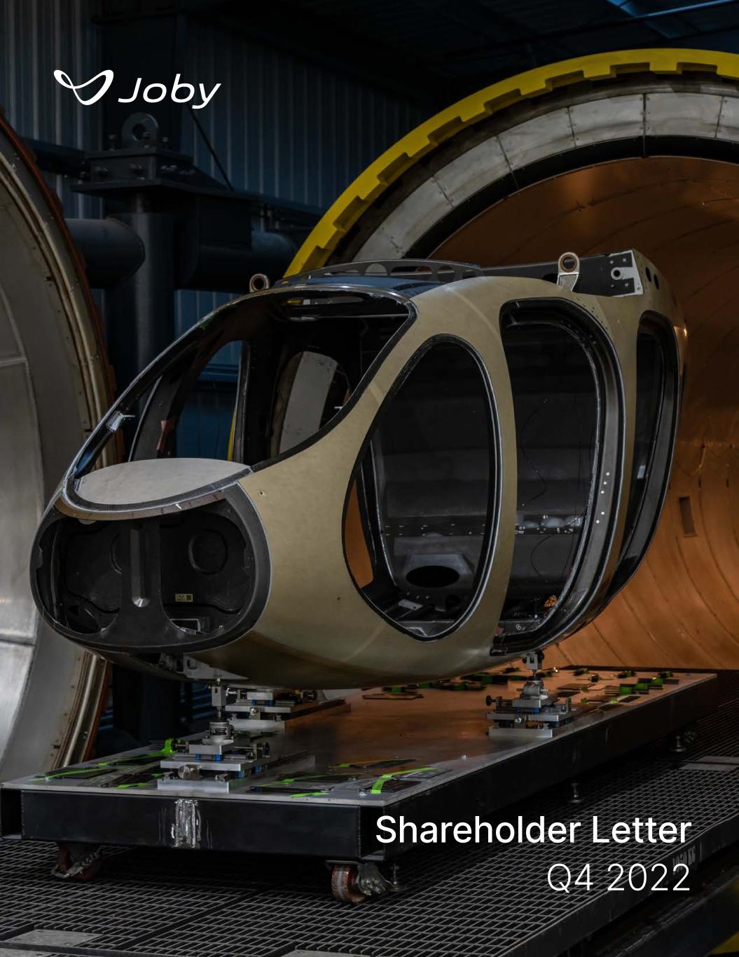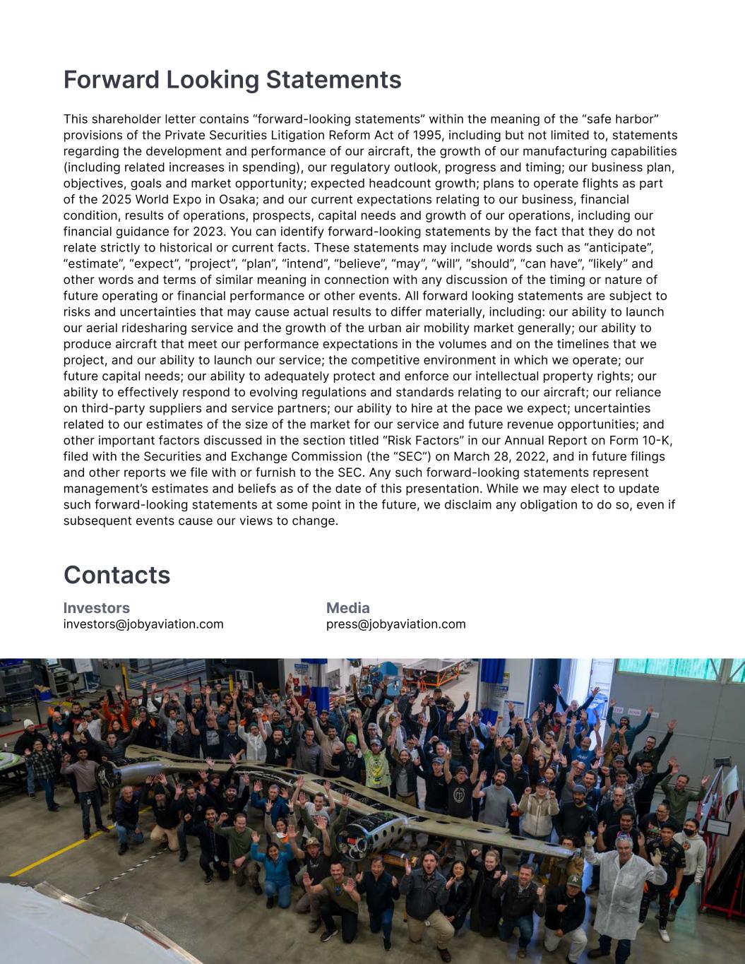 Forward Looking Statements This shareholder letter contains “forward-looking statements” within the meaning of the “safe harbor” provisions of the Private Securities Litigation Reform Act of 1995, including but not limited to, statements regarding the development and performance of our aircraft, the growth of our manufacturing capabilities (including related increases in spending), our regulatory outlook, progress and timing; our business plan, objectives, goals and market opportunity; expected headcount growth; plans to operate flights as part of the 2025 World Expo in Osaka; and our current expectations relating to our business, financial condition, results of operations, prospects, capital needs and growth of our operations, including our financial guidance for 2023. You can identify forward-looking statements by the fact that they do not relate strictly to historical or current facts. These statements may include words such as “anticipate”, “estimate”, “expect”, “project”, “plan”, “intend”, “believe”, “may”, “will”, “should”, “can have”, “likely” and other words and terms of similar meaning in connection with any discussion of the timing or nature of future operating or financial performance or other events. All forward looking statements are subject to risks and uncertainties that may cause actual results to differ materially, including: our ability to launch our aerial ridesharing service and the growth of the urban air mobility market generally; our ability to produce aircraft that meet our performance expectations in the volumes and on the timelines that we project, and our ability to launch our service; the competitive environment in which we operate; our future capital needs; our ability to adequately protect and enforce our intellectual property rights; our ability to effectively respond to evolving regulations and standards relating to our aircraft; our reliance on third-party suppliers and service partners; our ability to hire at the pace we expect; uncertainties related to our estimates of the size of the market for our service and future revenue opportunities; and other important factors discussed in the section titled “Risk Factors” in our Annual Report on Form 10-K, filed with the Securities and Exchange Commission (the “SEC”) on March 28, 2022, and in future filings and other reports we file with or furnish to the SEC. Any such forward-looking statements represent management’s estimates and beliefs as of the date of this presentation. While we may elect to update such forward-looking statements at some point in the future, we disclaim any obligation to do so, even if subsequent events cause our views to change. Contacts Investors Media investors@jobyaviation.com press@jobyaviation.com