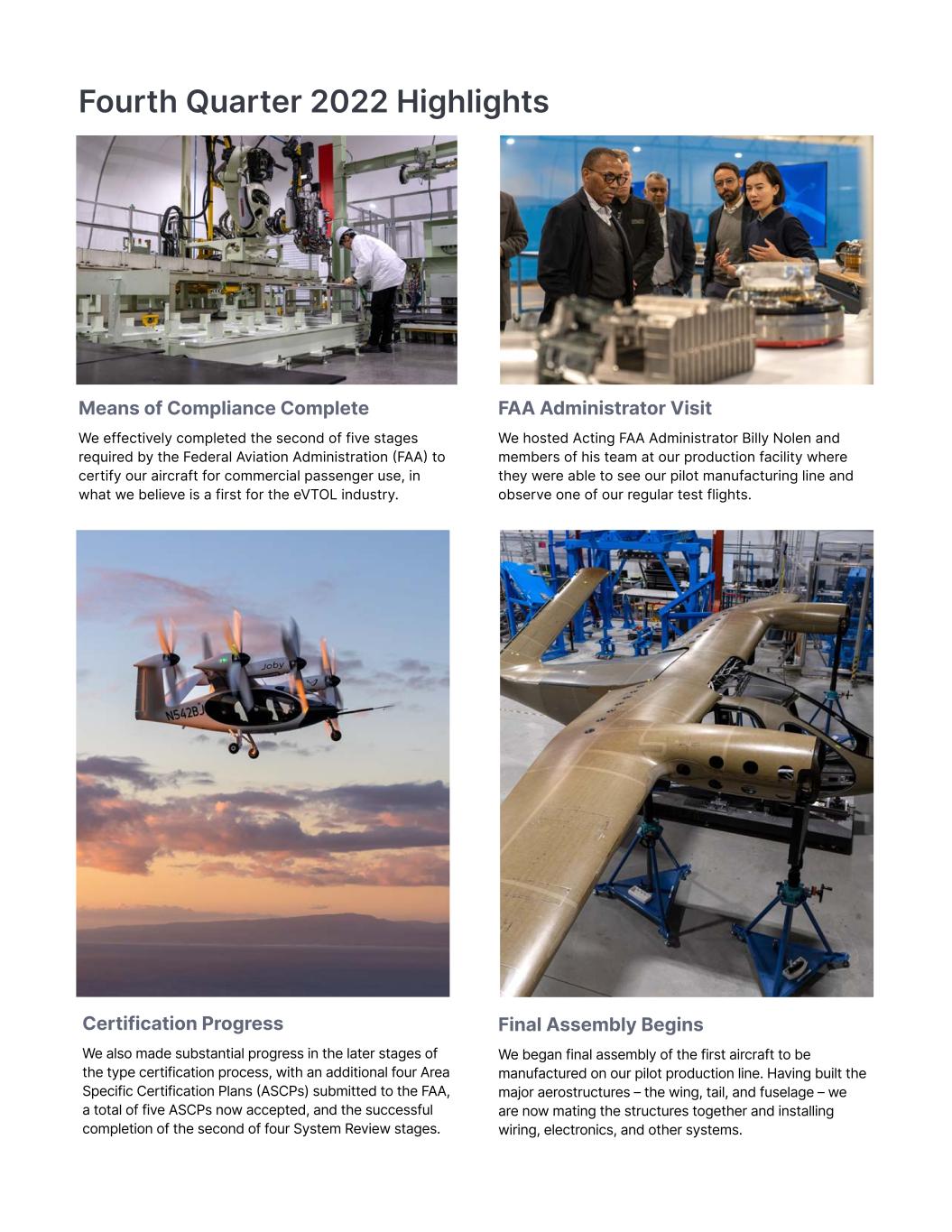 Fourth Quarter 2022 Highlights Means of Compliance Complete We effectively completed the second of five stages required by the Federal Aviation Administration (FAA) to certify our aircraft for commercial passenger use, in what we believe is a first for the eVTOL industry. Final Assembly Begins We began final assembly of the first aircraft to be manufactured on our pilot production line. Having built the major aerostructures – the wing, tail, and fuselage – we are now mating the structures together and installing wiring, electronics, and other systems. Certification Progress We also made substantial progress in the later stages of the type certification process, with an additional four Area Specific Certification Plans (ASCPs) submitted to the FAA, a total of five ASCPs now accepted, and the successful completion of the second of four System Review stages. FAA Administrator Visit We hosted Acting FAA Administrator Billy Nolen and members of his team at our production facility where they were able to see our pilot manufacturing line and observe one of our regular test flights.