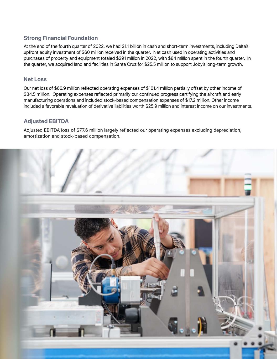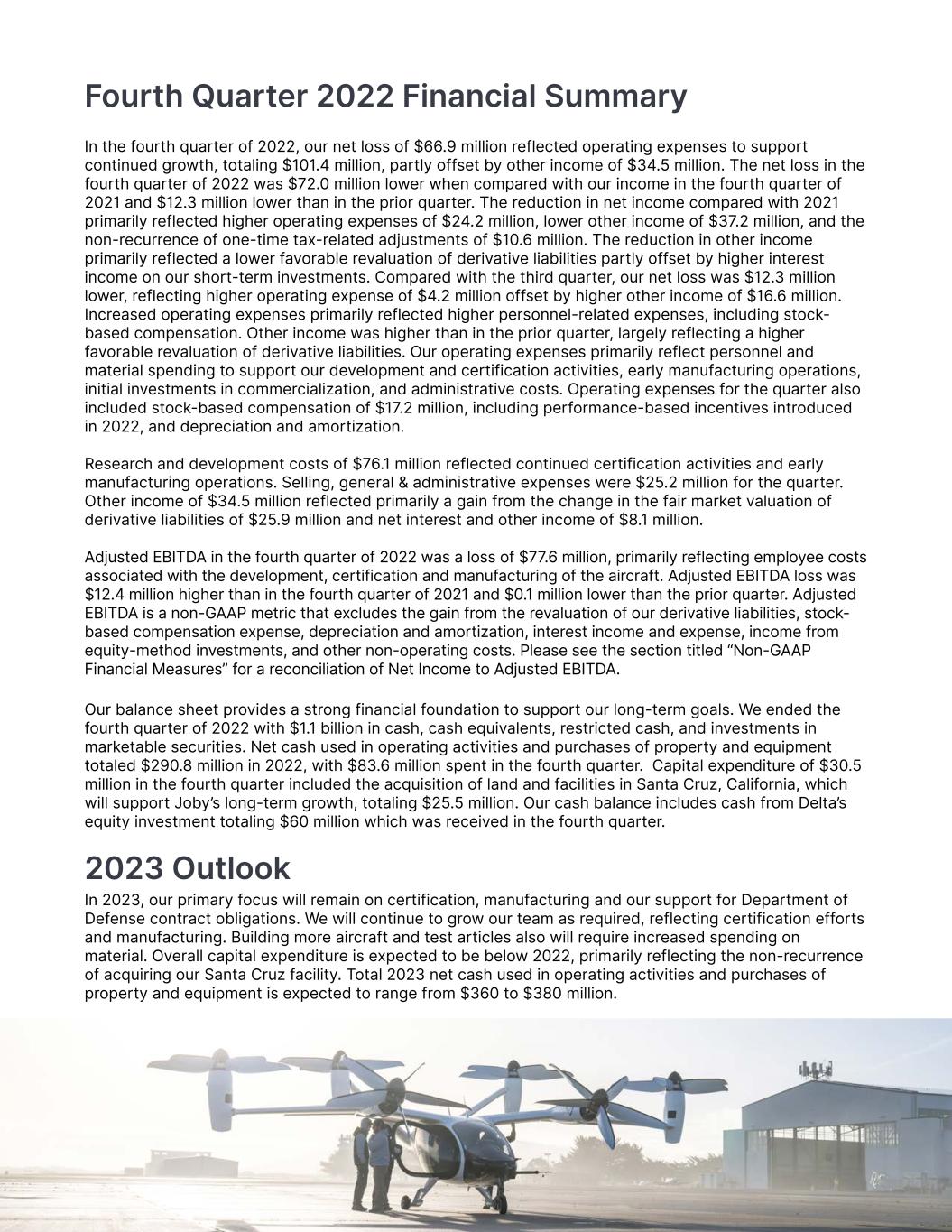 Fourth Quarter 2022 Financial Summary In the fourth quarter of 2022, our net loss of $66.9 million reflected operating expenses to support continued growth, totaling $101.4 million, partly offset by other income of $34.5 million. The net loss in the fourth quarter of 2022 was $72.0 million lower when compared with our income in the fourth quarter of 2021 and $12.3 million lower than in the prior quarter. The reduction in net income compared with 2021 primarily reflected higher operating expenses of $24.2 million, lower other income of $37.2 million, and the non-recurrence of one-time tax-related adjustments of $10.6 million. The reduction in other income primarily reflected a lower favorable revaluation of derivative liabilities partly offset by higher interest income on our short-term investments. Compared with the third quarter, our net loss was $12.3 million lower, reflecting higher operating expense of $4.2 million offset by higher other income of $16.6 million. Increased operating expenses primarily reflected higher personnel-related expenses, including stock- based compensation. Other income was higher than in the prior quarter, largely reflecting a higher favorable revaluation of derivative liabilities. Our operating expenses primarily reflect personnel and material spending to support our development and certification activities, early manufacturing operations, initial investments in commercialization, and administrative costs. Operating expenses for the quarter also included stock-based compensation of $17.2 million, including performance-based incentives introduced in 2022, and depreciation and amortization. Research and development costs of $76.1 million reflected continued certification activities and early manufacturing operations. Selling, general & administrative expenses were $25.2 million for the quarter. Other income of $34.5 million reflected primarily a gain from the change in the fair market valuation of derivative liabilities of $25.9 million and net interest and other income of $8.1 million. Adjusted EBITDA in the fourth quarter of 2022 was a loss of $77.6 million, primarily reflecting employee costs associated with the development, certification and manufacturing of the aircraft. Adjusted EBITDA loss was $12.4 million higher than in the fourth quarter of 2021 and $0.1 million lower than the prior quarter. Adjusted EBITDA is a non-GAAP metric that excludes the gain from the revaluation of our derivative liabilities, stock- based compensation expense, depreciation and amortization, interest income and expense, income from equity-method investments, and other non-operating costs. Please see the section titled “Non-GAAP Financial Measures” for a reconciliation of Net Income to Adjusted EBITDA. Our balance sheet provides a strong financial foundation to support our long-term goals. We ended the fourth quarter of 2022 with $1.1 billion in cash, cash equivalents, restricted cash, and investments in marketable securities. Net cash used in operating activities and purchases of property and equipment totaled $290.8 million in 2022, with $83.6 million spent in the fourth quarter. Capital expenditure of $30.5 million in the fourth quarter included the acquisition of land and facilities in Santa Cruz, California, which will support Joby’s long-term growth, totaling $25.5 million. Our cash balance includes cash from Delta’s equity investment totaling $60 million which was received in the fourth quarter. 2023 Outlook In 2023, our primary focus will remain on certification, manufacturing and our support for Department of Defense contract obligations. We will continue to grow our team as required, reflecting certification efforts and manufacturing. Building more aircraft and test articles also will require increased spending on material. Overall capital expenditure is expected to be below 2022, primarily reflecting the non-recurrence of acquiring our Santa Cruz facility. Total 2023 net cash used in operating activities and purchases of property and equipment is expected to range from $360 to $380 million.