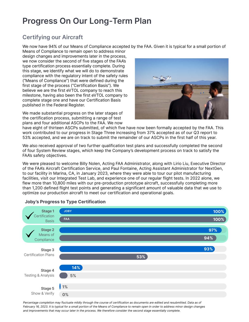 Progress On Our Long-Term Plan Certifying our Aircraft We now have 94% of our Means of Compliance accepted by the FAA. Given it is typical for a small portion of Means of Compliance to remain open to address minor design changes and improvements later in the process, we now consider the second of five stages of the FAA’s type certification process essentially complete. During this stage, we identify what we will do to demonstrate compliance with the regulatory intent of the safety rules (“Means of Compliance”) that were defined during the first stage of the process (“Certification Basis”). We believe we are the first eVTOL company to reach this milestone, having also been the first eVTOL company to complete stage one and have our Certification Basis published in the Federal Register. We made substantial progress on the later stages of the certification process, submitting a range of test plans and four additional ASCPs to the FAA. We now have eight of thirteen ASCPs submitted, of which five have now been formally accepted by the FAA. This work contributed to our progress in Stage Three increasing from 37% accepted as of our Q3 report to 53% accepted, and we are on track to submit the remainder of our ASCPs in the first half of this year. We also received approval of two further qualification test plans and successfully completed the second of four System Review stages, which keep the Company’s development process on track to satisfy the FAA’s safety objectives. We were pleased to welcome Billy Nolen, Acting FAA Administrator, along with Lirio Liu, Executive Director of the FAA’s Aircraft Certification Service, and Paul Fontaine, Acting Assistant Administrator for NextGen, to our facility in Marina, CA, in January 2023, where they were able to tour our pilot manufacturing facilities, visit our Integrated Test Lab, and experience one of our regular flight tests. In 2022 alone, we flew more than 10,800 miles with our pre-production prototype aircraft, successfully completing more than 1,200 defined flight test points and generating a significant amount of valuable data that we use to optimize our production aircraft to meet our certification and operational goals. 100% 97% 94% 93% 53% 14% 5% Stage 1 Certification Basis Stage 2 Means of Compliance Stage 3 Certification Plans Stage 4 Testing & Analysis Stage 5 Show & Verify JOBY FAA 100% 1% 0% Joby’s Progress to Type Certification Percentage completion may fluctuate mildly through the course of certification as documents are edited and resubmitted. Data as of February 16, 2023. It is typical for a small portion of the Means of Compliance to remain open in order to address minor design changes and improvements that may occur later in the process. We therefore consider the second stage essentially complete.