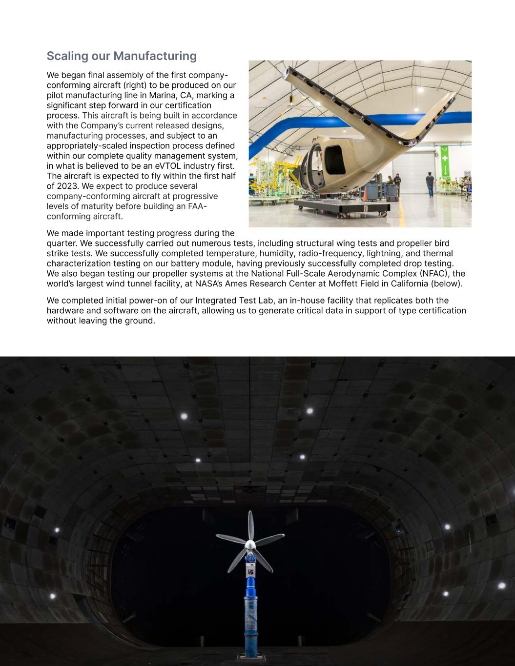 Scaling our Manufacturing We began final assembly of the first company- conforming aircraft (right) to be produced on our pilot manufacturing line in Marina, CA, marking a significant step forward in our certification process. This aircraft is being built in accordance with the Company’s current released designs, manufacturing processes, and subject to an appropriately-scaled inspection process defined within our complete quality management system, in what is believed to be an eVTOL industry first. The aircraft is expected to fly within the first half of 2023. We expect to produce several company-conforming aircraft at progressive levels of maturity before building an FAA- conforming aircraft. We made important testing progress during the quarter. We successfully carried out numerous tests, including structural wing tests and propeller bird strike tests. We successfully completed temperature, humidity, radio-frequency, lightning, and thermal characterization testing on our battery module, having previously successfully completed drop testing. We also began testing our propeller systems at the National Full-Scale Aerodynamic Complex (NFAC), the world’s largest wind tunnel facility, at NASA’s Ames Research Center at Moffett Field in California (below). We completed initial power-on of our Integrated Test Lab, an in-house facility that replicates both the hardware and software on the aircraft, allowing us to generate critical data in support of type certification without leaving the ground. 4