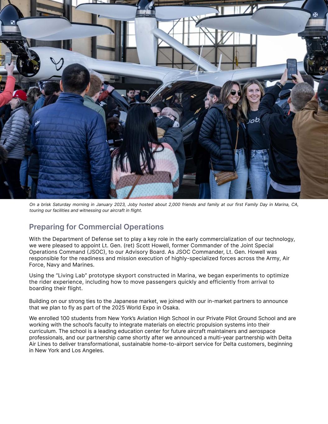 On a brisk Saturday morning in January 2023, Joby hosted about 2,000 friends and family at our first Family Day in Marina, CA, touring our facilities and witnessing our aircraft in flight. Preparing for Commercial Operations With the Department of Defense set to play a key role in the early commercialization of our technology, we were pleased to appoint Lt. Gen. (ret) Scott Howell, former Commander of the Joint Special Operations Command (JSOC), to our Advisory Board. As JSOC Commander, Lt. Gen. Howell was responsible for the readiness and mission execution of highly-specialized forces across the Army, Air Force, Navy and Marines. Using the “Living Lab” prototype skyport constructed in Marina, we began experiments to optimize the rider experience, including how to move passengers quickly and efficiently from arrival to boarding their flight. Building on our strong ties to the Japanese market, we joined with our in-market partners to announce that we plan to fly as part of the 2025 World Expo in Osaka. We enrolled 100 students from New York’s Aviation High School in our Private Pilot Ground School and are working with the school’s faculty to integrate materials on electric propulsion systems into their curriculum. The school is a leading education center for future aircraft maintainers and aerospace professionals, and our partnership came shortly after we announced a multi-year partnership with Delta Air Lines to deliver transformational, sustainable home-to-airport service for Delta customers, beginning in New York and Los Angeles.