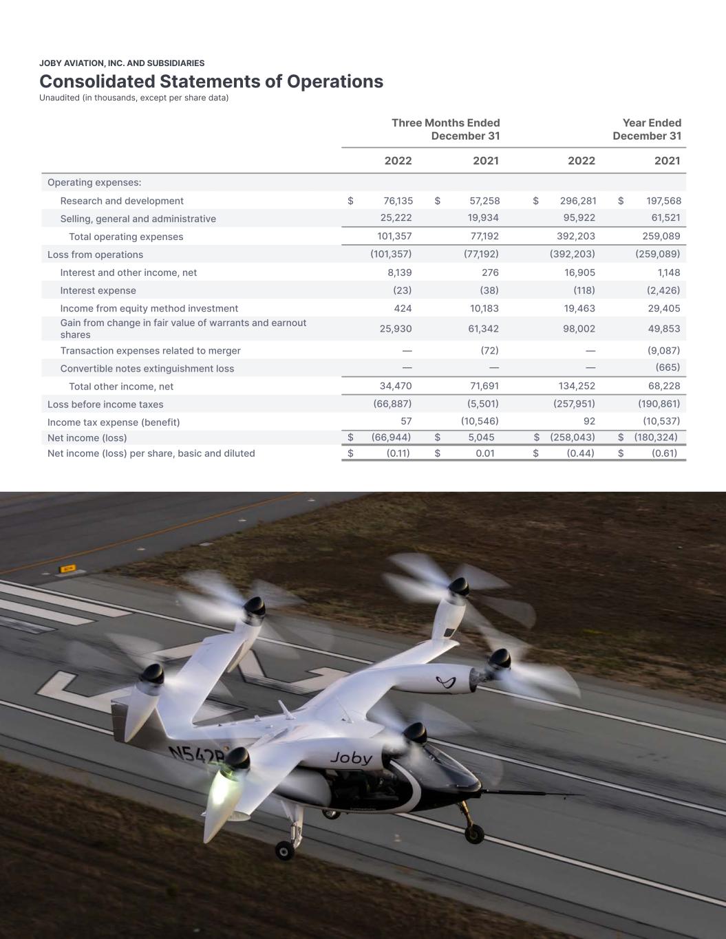 Three Months Ended December 31 Year Ended December 31 2022 2021 2022 2021 Operating expenses: Research and development $ 76,135 $ 57,258 $ 296,281 $ 197,568 Selling, general and administrative 25,222 19,934 95,922 61,521 Total operating expenses 101,357 77,192 392,203 259,089 Loss from operations (101,357) (77,192) (392,203) (259,089) Interest and other income, net 8,139 276 16,905 1,148 Interest expense (23) (38) (118) (2,426) Income from equity method investment 424 10,183 19,463 29,405 Gain from change in fair value of warrants and earnout shares 25,930 61,342 98,002 49,853 Transaction expenses related to merger — (72) — (9,087) Convertible notes extinguishment loss — — — (665) Total other income, net 34,470 71,691 134,252 68,228 Loss before income taxes (66,887) (5,501) (257,951) (190,861) Income tax expense (benefit) 57 (10,546) 92 (10,537) Net income (loss) $ (66,944) $ 5,045 $ (258,043) $ (180,324) Net income (loss) per share, basic and diluted $ (0.11) $ 0.01 $ (0.44) $ (0.61) JOBY AVIATION, INC. AND SUBSIDIARIES Consolidated Statements of Operations Unaudited (in thousands, except per share data)