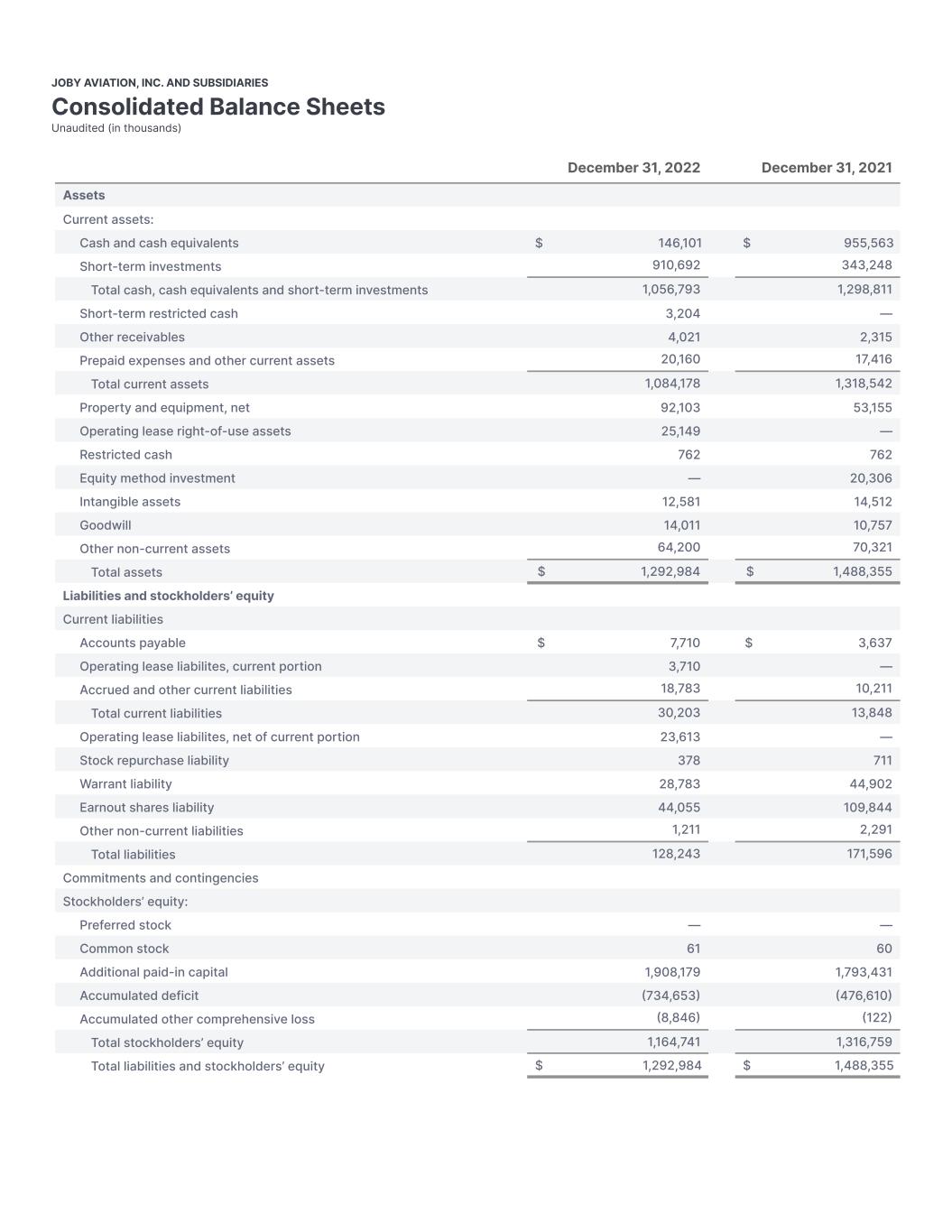 December 31, 2022 December 31, 2021 Assets Current assets: Cash and cash equivalents $ 146,101 $ 955,563 Short-term investments 910,692 343,248 Total cash, cash equivalents and short-term investments 1,056,793 1,298,811 Short-term restricted cash 3,204 — Other receivables 4,021 2,315 Prepaid expenses and other current assets 20,160 17,416 Total current assets 1,084,178 1,318,542 Property and equipment, net 92,103 53,155 Operating lease right-of-use assets 25,149 — Restricted cash 762 762 Equity method investment — 20,306 Intangible assets 12,581 14,512 Goodwill 14,011 10,757 Other non-current assets 64,200 70,321 Total assets $ 1,292,984 $ 1,488,355 Liabilities and stockholders’ equity Current liabilities Accounts payable $ 7,710 $ 3,637 Operating lease liabilites, current portion 3,710 — Accrued and other current liabilities 18,783 10,211 Total current liabilities 30,203 13,848 Operating lease liabilites, net of current portion 23,613 — Stock repurchase liability 378 711 Warrant liability 28,783 44,902 Earnout shares liability 44,055 109,844 Other non-current liabilities 1,211 2,291 Total liabilities 128,243 171,596 Commitments and contingencies Stockholders’ equity: Preferred stock — — Common stock 61 60 Additional paid-in capital 1,908,179 1,793,431 Accumulated deficit (734,653) (476,610) Accumulated other comprehensive loss (8,846) (122) Total stockholders’ equity 1,164,741 1,316,759 Total liabilities and stockholders’ equity $ 1,292,984 $ 1,488,355 JOBY AVIATION, INC. AND SUBSIDIARIES Consolidated Balance Sheets Unaudited (in thousands)