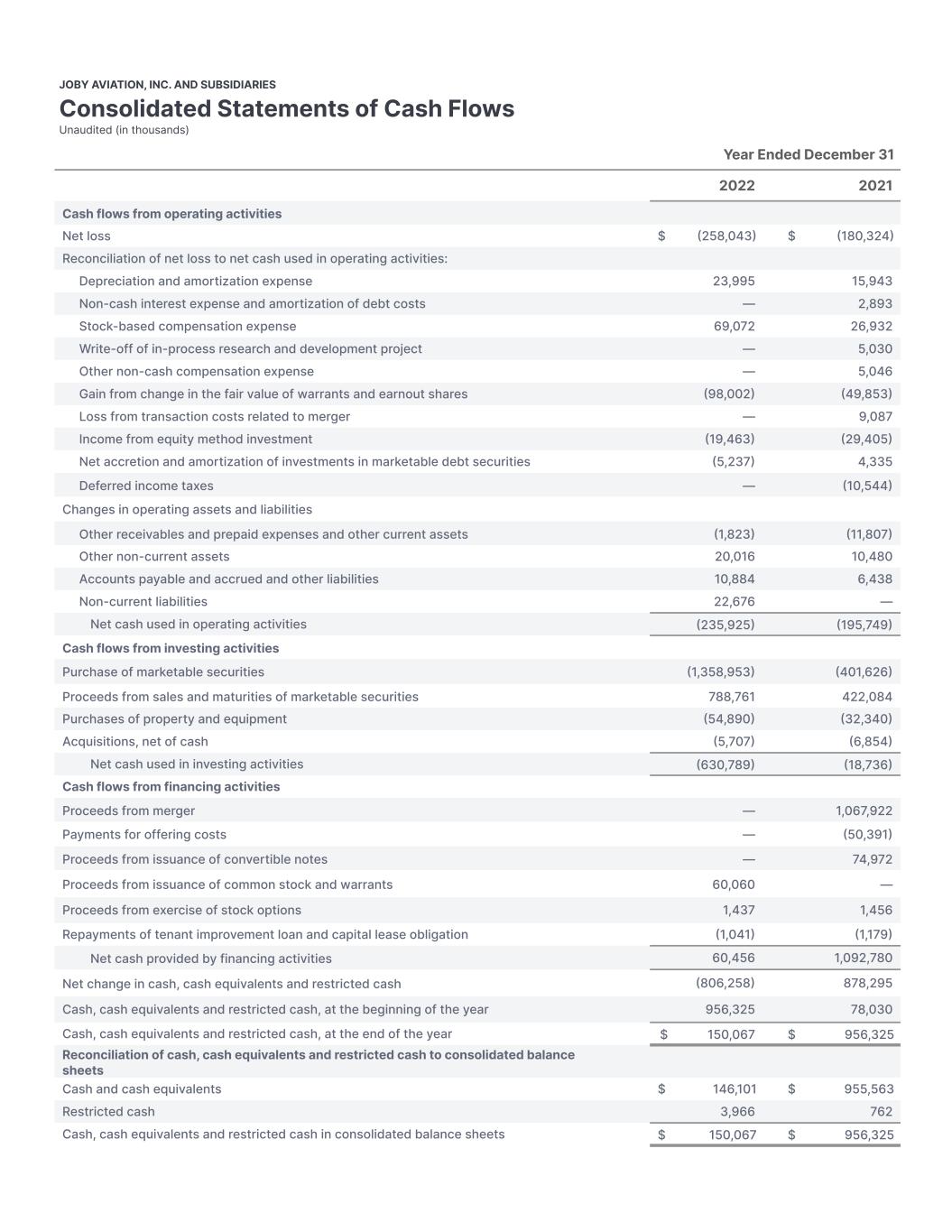Year Ended December 31 2022 2021 Cash flows from operating activities Net loss $ (258,043) $ (180,324) Reconciliation of net loss to net cash used in operating activities: Depreciation and amortization expense 23,995 15,943 Non-cash interest expense and amortization of debt costs — 2,893 Stock-based compensation expense 69,072 26,932 Write-off of in-process research and development project — 5,030 Other non-cash compensation expense — 5,046 Gain from change in the fair value of warrants and earnout shares (98,002) (49,853) Loss from transaction costs related to merger — 9,087 Income from equity method investment (19,463) (29,405) Net accretion and amortization of investments in marketable debt securities (5,237) 4,335 Deferred income taxes — (10,544) Changes in operating assets and liabilities Other receivables and prepaid expenses and other current assets (1,823) (11,807) Other non-current assets 20,016 10,480 Accounts payable and accrued and other liabilities 10,884 6,438 Non-current liabilities 22,676 — Net cash used in operating activities (235,925) (195,749) Cash flows from investing activities Purchase of marketable securities (1,358,953) (401,626) Proceeds from sales and maturities of marketable securities 788,761 422,084 Purchases of property and equipment (54,890) (32,340) Acquisitions, net of cash (5,707) (6,854) Net cash used in investing activities (630,789) (18,736) Cash flows from financing activities Proceeds from merger — 1,067,922 Payments for offering costs — (50,391) Proceeds from issuance of convertible notes — 74,972 Proceeds from issuance of common stock and warrants 60,060 — Proceeds from exercise of stock options 1,437 1,456 Repayments of tenant improvement loan and capital lease obligation (1,041) (1,179) Net cash provided by financing activities 60,456 1,092,780 Net change in cash, cash equivalents and restricted cash (806,258) 878,295 Cash, cash equivalents and restricted cash, at the beginning of the year 956,325 78,030 Cash, cash equivalents and restricted cash, at the end of the year $ 150,067 $ 956,325 Reconciliation of cash, cash equivalents and restricted cash to consolidated balance sheets Cash and cash equivalents $ 146,101 $ 955,563 Restricted cash 3,966 762 Cash, cash equivalents and restricted cash in consolidated balance sheets $ 150,067 $ 956,325 JOBY AVIATION, INC. AND SUBSIDIARIES Consolidated Statements of Cash Flows Unaudited (in thousands)
