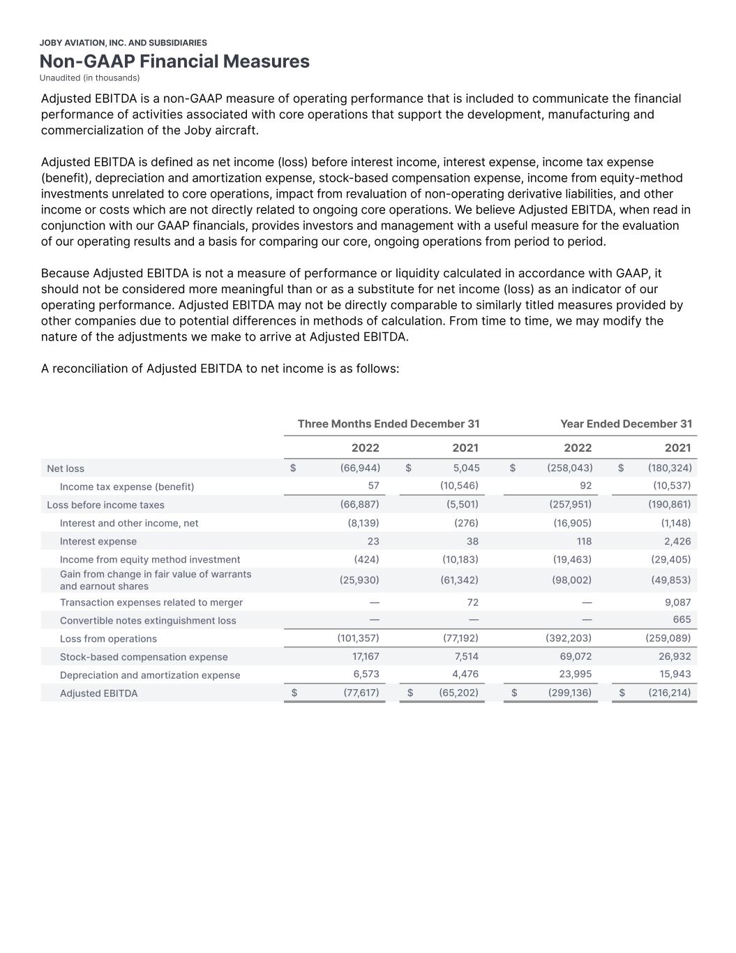 Three Months Ended December 31 Year Ended December 31 2022 2021 2022 2021 Net loss $ (66,944) $ 5,045 $ (258,043) $ (180,324) Income tax expense (benefit) 57 (10,546) 92 (10,537) Loss before income taxes (66,887) (5,501) (257,951) (190,861) Interest and other income, net (8,139) (276) (16,905) (1,148) Interest expense 23 38 118 2,426 Income from equity method investment (424) (10,183) (19,463) (29,405) Gain from change in fair value of warrants and earnout shares (25,930) (61,342) (98,002) (49,853) Transaction expenses related to merger — 72 — 9,087 Convertible notes extinguishment loss — — — 665 Loss from operations (101,357) (77,192) (392,203) (259,089) Stock-based compensation expense 17,167 7,514 69,072 26,932 Depreciation and amortization expense 6,573 4,476 23,995 15,943 Adjusted EBITDA $ (77,617) $ (65,202) $ (299,136) $ (216,214) JOBY AVIATION, INC. AND SUBSIDIARIES Non-GAAP Financial Measures Unaudited (in thousands) Adjusted EBITDA is a non-GAAP measure of operating performance that is included to communicate the financial performance of activities associated with core operations that support the development, manufacturing and commercialization of the Joby aircraft. Adjusted EBITDA is defined as net income (loss) before interest income, interest expense, income tax expense (benefit), depreciation and amortization expense, stock-based compensation expense, income from equity-method investments unrelated to core operations, impact from revaluation of non-operating derivative liabilities, and other income or costs which are not directly related to ongoing core operations. We believe Adjusted EBITDA, when read in conjunction with our GAAP financials, provides investors and management with a useful measure for the evaluation of our operating results and a basis for comparing our core, ongoing operations from period to period. Because Adjusted EBITDA is not a measure of performance or liquidity calculated in accordance with GAAP, it should not be considered more meaningful than or as a substitute for net income (loss) as an indicator of our operating performance. Adjusted EBITDA may not be directly comparable to similarly titled measures provided by other companies due to potential differences in methods of calculation. From time to time, we may modify the nature of the adjustments we make to arrive at Adjusted EBITDA. A reconciliation of Adjusted EBITDA to net income is as follows: