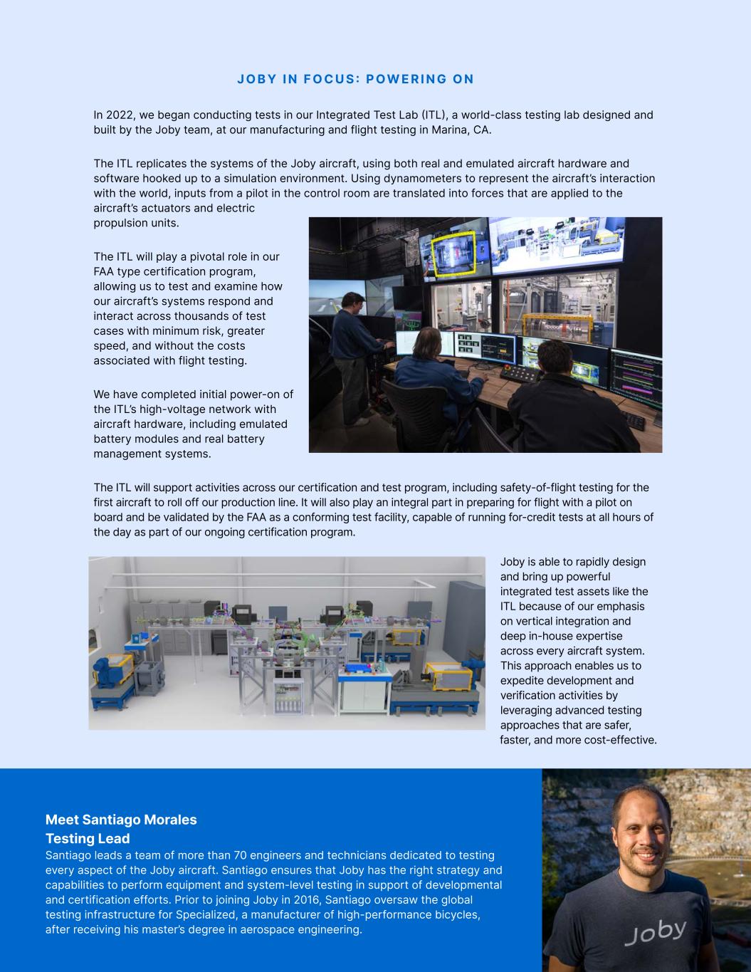 J O B Y I N F O C U S : P O W E R I N G O N In 2022, we began conducting tests in our Integrated Test Lab (ITL), a world-class testing lab designed and built by the Joby team, at our manufacturing and flight testing in Marina, CA. The ITL replicates the systems of the Joby aircraft, using both real and emulated aircraft hardware and software hooked up to a simulation environment. Using dynamometers to represent the aircraft’s interaction with the world, inputs from a pilot in the control room are translated into forces that are applied to the aircraft’s actuators and electric propulsion units. The ITL will play a pivotal role in our FAA type certification program, allowing us to test and examine how our aircraft’s systems respond and interact across thousands of test cases with minimum risk, greater speed, and without the costs associated with flight testing. We have completed initial power-on of the ITL’s high-voltage network with aircraft hardware, including emulated battery modules and real battery management systems. The ITL will support activities across our certification and test program, including safety-of-flight testing for the first aircraft to roll off our production line. It will also play an integral part in preparing for flight with a pilot on board and be validated by the FAA as a conforming test facility, capable of running for-credit tests at all hours of the day as part of our ongoing certification program. Joby is able to rapidly design and bring up powerful integrated test assets like the ITL because of our emphasis on vertical integration and deep in-house expertise across every aircraft system. This approach enables us to expedite development and verification activities by leveraging advanced testing approaches that are safer, faster, and more cost-effective. 10 Meet Santiago Morales Testing Lead Santiago leads a team of more than 70 engineers and technicians dedicated to testing every aspect of the Joby aircraft. Santiago ensures that Joby has the right strategy and capabilities to perform equipment and system-level testing in support of developmental and certification efforts. Prior to joining Joby in 2016, Santiago oversaw the global testing infrastructure for Specialized, a manufacturer of high-performance bicycles, after receiving his master’s degree in aerospace engineering.