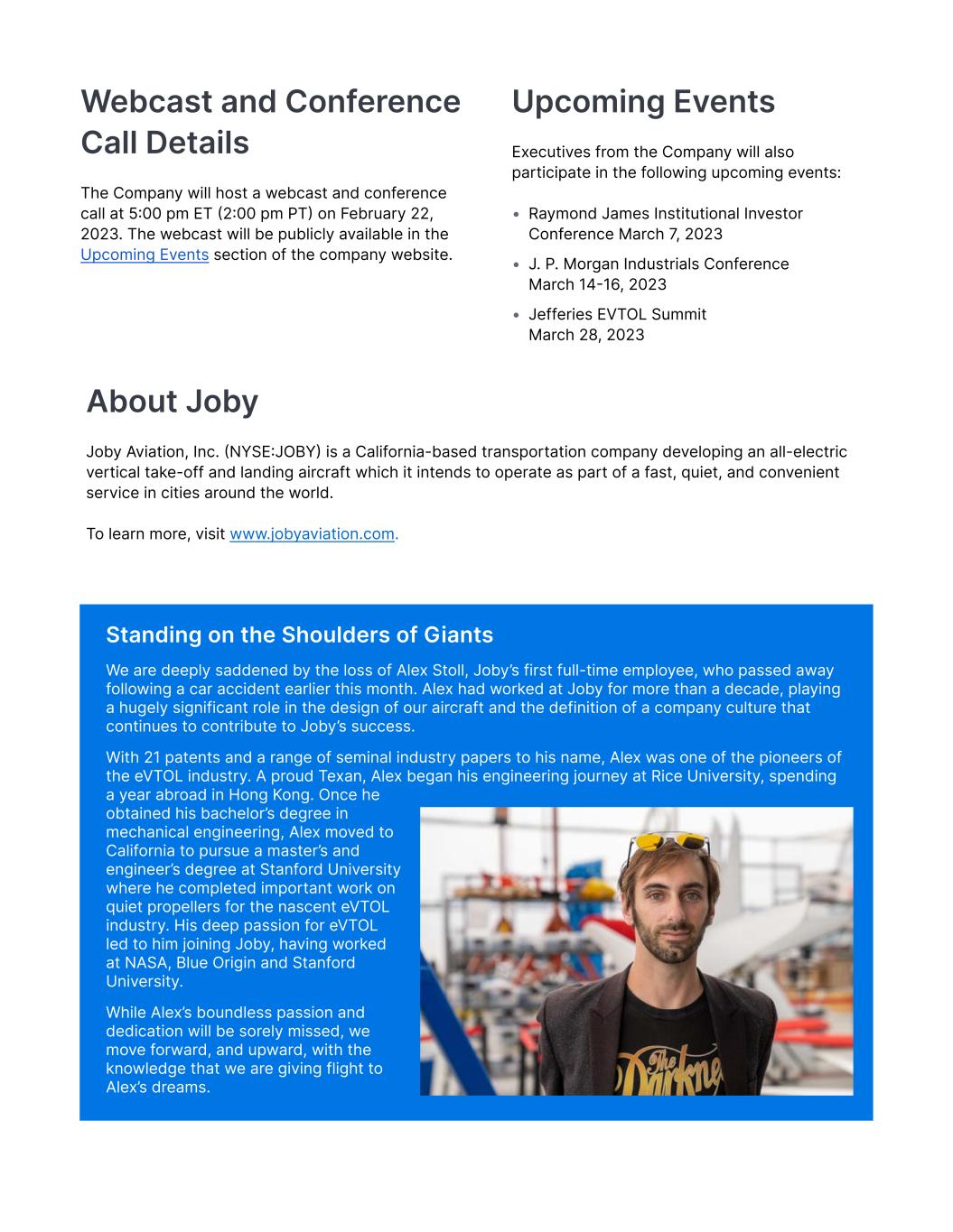 Webcast and Conference Call Details The Company will host a webcast and conference call at 5:00 pm ET (2:00 pm PT) on February 22, 2023. The webcast will be publicly available in the Upcoming Events section of the company website. 11 Upcoming Events Executives from the Company will also participate in the following upcoming events: • Raymond James Institutional Investor Conference March 7, 2023 • J. P. Morgan Industrials Conference March 14-16, 2023 • Jefferies EVTOL Summit March 28, 2023 About Joby Joby Aviation, Inc. (NYSE:JOBY) is a California-based transportation company developing an all-electric vertical take-off and landing aircraft which it intends to operate as part of a fast, quiet, and convenient service in cities around the world. To learn more, visit www.jobyaviation.com. Standing on the Shoulders of Giants We are deeply saddened by the loss of Alex Stoll, Joby’s first full-time employee, who passed away following a car accident earlier this month. Alex had worked at Joby for more than a decade, playing a hugely significant role in the design of our aircraft and the definition of a company culture that continues to contribute to Joby’s success. With 21 patents and a range of seminal industry papers to his name, Alex was one of the pioneers of the eVTOL industry. A proud Texan, Alex began his engineering journey at Rice University, spending a year abroad in Hong Kong. Once he obtained his bachelor’s degree in mechanical engineering, Alex moved to California to pursue a master’s and engineer’s degree at Stanford University where he completed important work on quiet propellers for the nascent eVTOL industry. His deep passion for eVTOL led to him joining Joby, having worked at NASA, Blue Origin and Stanford University. While Alex’s boundless passion and dedication will be sorely missed, we move forward, and upward, with the knowledge that we are giving flight to Alex’s dreams.