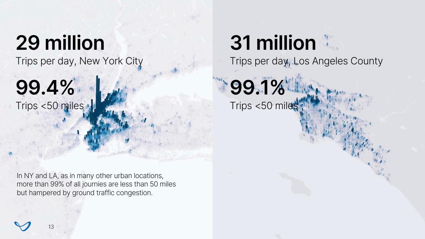 29 million Trips per day, New York City 99.4% Trips <50 miles 31 million Trips per day, Los Angeles County 99.1% Trips <50 miles In NY and LA, as in many other urban locations, more than 99% of all journies are less than 50 miles but hampered by ground traffic congestion. 13