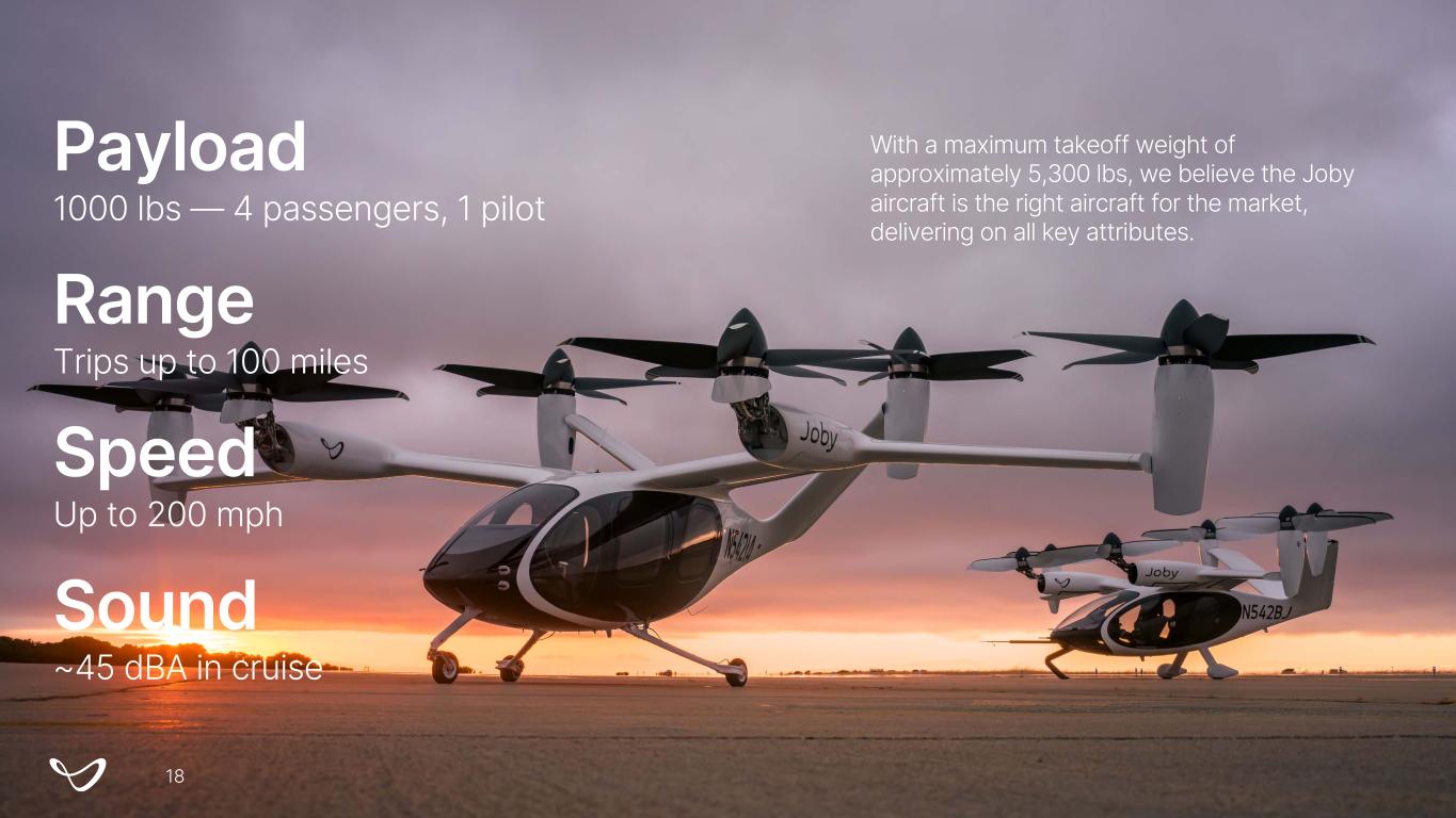 Payload 1000 lbs — 4 passengers, 1 pilot Range Trips up to 100 miles Speed Up to 200 mph Sound ~45 dBA in cruise With a maximum takeoff weight of approximately 5,300 lbs, we believe the Joby aircraft is the right aircraft for the market, delivering on all key attributes. 18