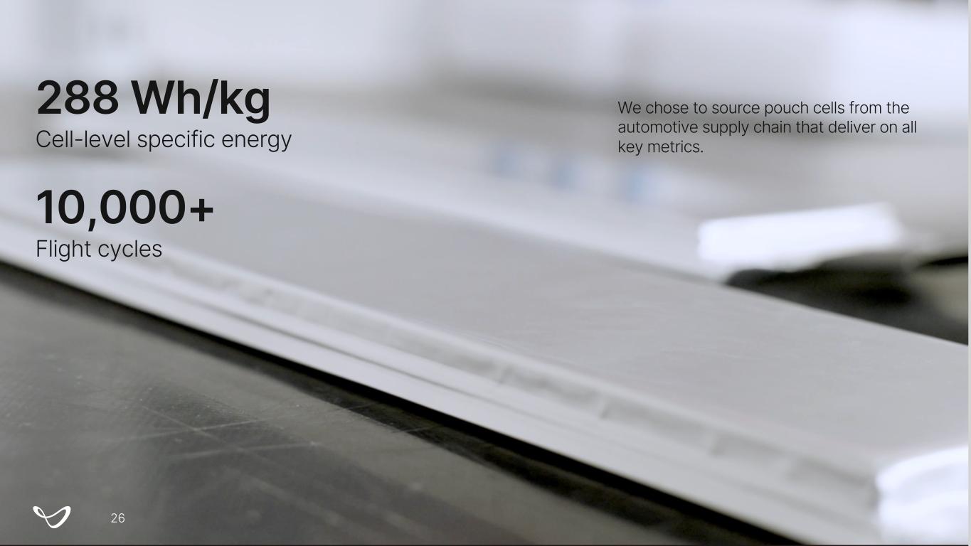We chose to source pouch cells from the automotive supply chain that deliver on all key metrics. 26 288 Wh/kg Cell-level specific energy 10,000+ Flight cycles