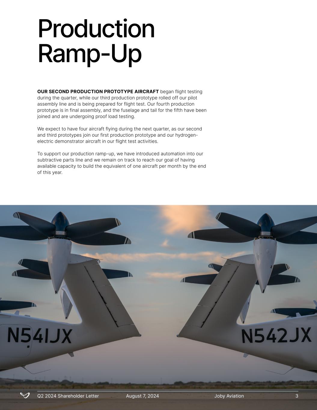 Production Ramp-Up Joby AviationQ2 2024 Shareholder Letter August 7, 2024 3 OUR SECOND PRODUCTION PROTOTYPE AIRCRAFT began flight testing during the quarter, while our third production prototype rolled off our pilot assembly line and is being prepared for flight test. Our fourth production prototype is in final assembly, and the fuselage and tail for the fifth have been joined and are undergoing proof load testing. We expect to have four aircraft flying during the next quarter, as our second and third prototypes join our first production prototype and our hydrogen- electric demonstrator aircraft in our flight test activities. To support our production ramp-up, we have introduced automation into our subtractive parts line and we remain on track to reach our goal of having available capacity to build the equivalent of one aircraft per month by the end of this year.