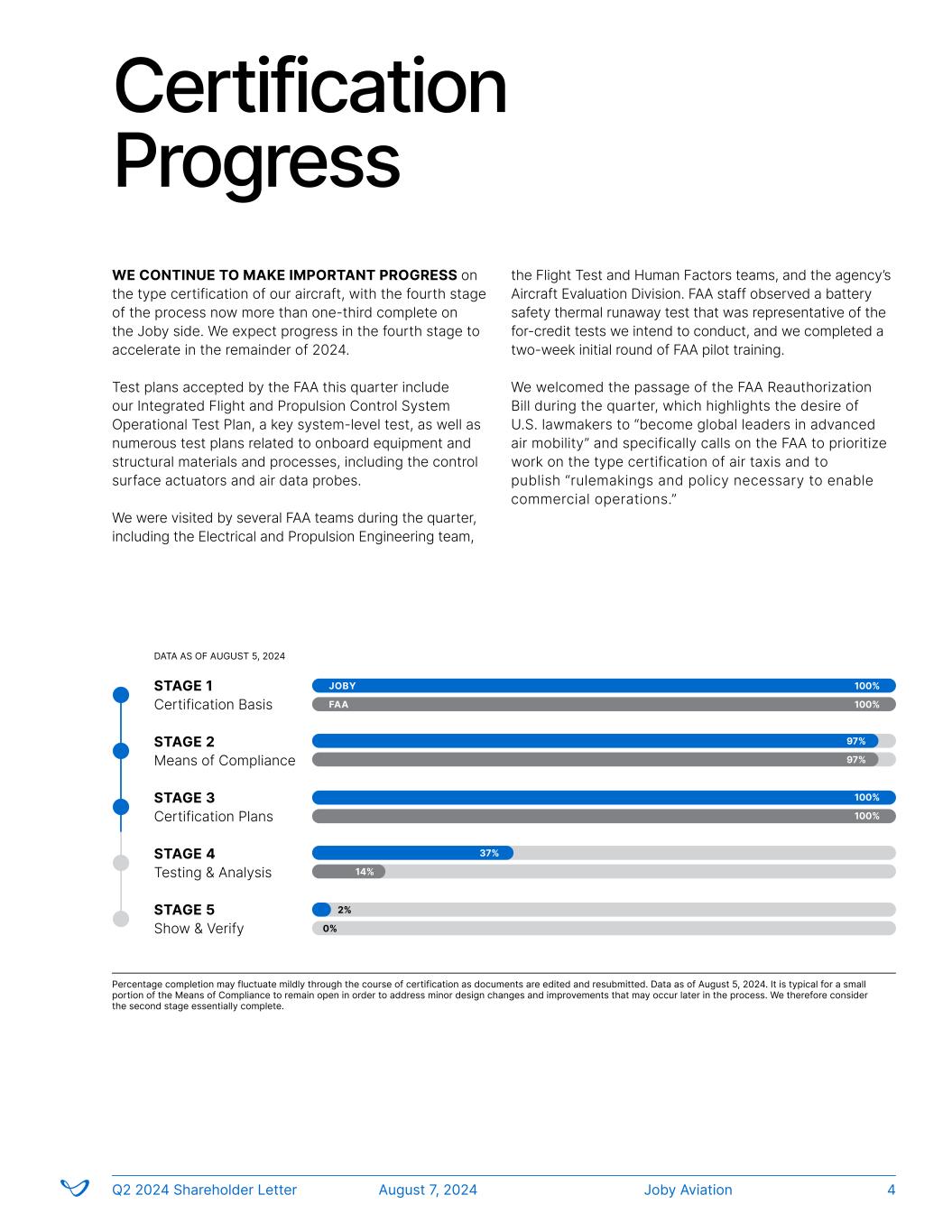 Certification Progress WE CONTINUE TO MAKE IMPORTANT PROGRESS on the type certification of our aircraft, with the fourth stage of the process now more than one-third complete on the Joby side. We expect progress in the fourth stage to accelerate in the remainder of 2024. Test plans accepted by the FAA this quarter include our Integrated Flight and Propulsion Control System Operational Test Plan, a key system-level test, as well as numerous test plans related to onboard equipment and structural materials and processes, including the control surface actuators and air data probes. We were visited by several FAA teams during the quarter, including the Electrical and Propulsion Engineering team, the Flight Test and Human Factors teams, and the agency’s Aircraft Evaluation Division. FAA staff observed a battery safety thermal runaway test that was representative of the for-credit tests we intend to conduct, and we completed a two-week initial round of FAA pilot training. We welcomed the passage of the FAA Reauthorization Bill during the quarter, which highlights the desire of U.S. lawmakers to “become global leaders in advanced air mobility” and specifically calls on the FAA to prioritize work on the type certification of air taxis and to publish “rulemakings and policy necessary to enable commercial operations.” Percentage completion may fluctuate mildly through the course of certification as documents are edited and resubmitted. Data as of August 5, 2024. It is typical for a small portion of the Means of Compliance to remain open in order to address minor design changes and improvements that may occur later in the process. We therefore consider the second stage essentially complete. Joby’s Progress to Type Certification STAGE 1 Certification Basis STAGE 2 Means of Compliance STAGE 3 Certification Plans STAGE 4 Testing & Analysis STAGE 5 Show & Verify JOBY 100% 97% 37% 2% FAA 100% 97% 14% 0% DATA AS OF AUGUST 5, 2024 Joby AviationQ2 2024 Shareholder Letter August 7, 2024 4 100% 100%