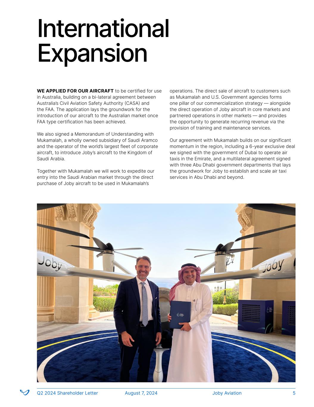 International Expansion WE APPLIED FOR OUR AIRCRAFT to be certified for use in Australia, building on a bi-lateral agreement between Australia’s Civil Aviation Safety Authority (CASA) and the FAA. The application lays the groundwork for the introduction of our aircraft to the Australian market once FAA type certification has been achieved. We also signed a Memorandum of Understanding with Mukamalah, a wholly owned subsidiary of Saudi Aramco and the operator of the world’s largest fleet of corporate aircraft, to introduce Joby’s aircraft to the Kingdom of Saudi Arabia. Together with Mukamalah we will work to expedite our entry into the Saudi Arabian market through the direct purchase of Joby aircraft to be used in Mukamalah’s operations. The direct sale of aircraft to customers such as Mukamalah and U.S. Government agencies forms one pillar of our commercialization strategy — alongside the direct operation of Joby aircraft in core markets and partnered operations in other markets — and provides the opportunity to generate recurring revenue via the provision of training and maintenance services. Our agreement with Mukamalah builds on our significant momentum in the region, including a 6-year exclusive deal we signed with the government of Dubai to operate air taxis in the Emirate, and a multilateral agreement signed with three Abu Dhabi government departments that lays the groundwork for Joby to establish and scale air taxi services in Abu Dhabi and beyond. Joby AviationQ2 2024 Shareholder Letter August 7, 2024 5