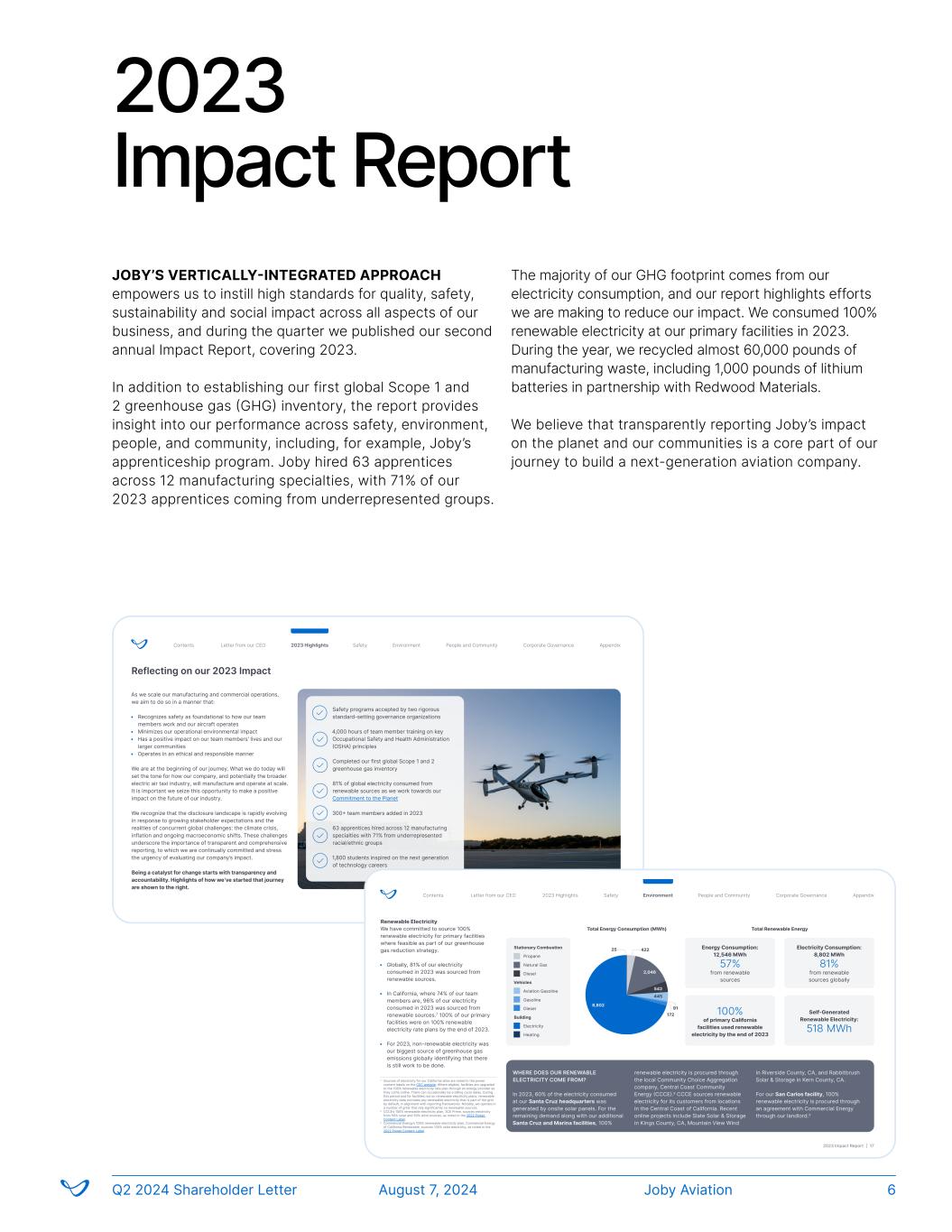 JOBY’S VERTICALLY-INTEGRATED APPROACH empowers us to instill high standards for quality, safety, sustainability and social impact across all aspects of our business, and during the quarter we published our second annual Impact Report, covering 2023. In addition to establishing our first global Scope 1 and 2 greenhouse gas (GHG) inventory, the report provides insight into our performance across safety, environment, people, and community, including, for example, Joby’s apprenticeship program. Joby hired 63 apprentices across 12 manufacturing specialties, with 71% of our 2023 apprentices coming from underrepresented groups. The majority of our GHG footprint comes from our electricity consumption, and our report highlights efforts we are making to reduce our impact. We consumed 100% renewable electricity at our primary facilities in 2023. During the year, we recycled almost 60,000 pounds of manufacturing waste, including 1,000 pounds of lithium batteries in partnership with Redwood Materials. We believe that transparently reporting Joby’s impact on the planet and our communities is a core part of our journey to build a next-generation aviation company. 2023 Impact Report Reflecting on our 2023 Impact As we scale our manufacturing and commercial operations, we aim to do so in a manner that: • Recognizes safety as foundational to how our team members work and our aircraft operates • Minimizes our operational environmental impact • Has a positive impact on our team members’ lives and our larger communities • Operates in an ethical and responsible manner We are at the beginning of our journey. What we do today will set the tone for how our company, and potentially the broader electric air taxi industry, will manufacture and operate at scale. It is important we seize this opportunity to make a positive impact on the future of our industry. We recognize that the disclosure landscape is rapidly evolving in response to growing stakeholder expectations and the realities of concurrent global challenges: the climate crisis, inflation and ongoing macroeconomic shifts. These challenges underscore the importance of transparent and comprehensive reporting, to which we are continually committed and stress the urgency of evaluating our company’s impact. Being a catalyst for change starts with transparency and accountability. Highlights of how we’ve started that journey are shown to the right. Safety programs accepted by two rigorous standard-setting governance organizations 4,000 hours of team member training on key Occupational Safety and Health Administration (OSHA) principles Completed our first global Scope 1 and 2 greenhouse gas inventory 81% of global electricity consumed from renewable sources as we work towards our Commitment to the Planet 300+ team members added in 2023 63 apprentices hired across 12 manufacturing specialties with 71% from underrepresented racial/ethnic groups 1,800 students inspired on the next generation of technology careers Letter from our CEO 2023 Highlights 2023 Impact Report | 7 Contents AppendixSafety Environment People and Community Corporate Governance Stationary Combustion Propane Natural Gas Diesel Vehicles Aviation Gasoline Gasoline Diesel Building Electricity Heating Energy Consumption: 12,546 MWh 57% from renewable sources Total Energy Consumption (MWh) Renewable Electricity We have committed to source 100% renewable electricity for primary facilities where feasible as part of our greenhouse gas reduction strategy. • Globally, 81% of our electricity consumed in 2023 was sourced from renewable sources. • In California, where 74% of our team members are, 96% of our electricity consumed in 2023 was sourced from renewable sources.7 100% of our primary facilities were on 100% renewable electricity rate plans by the end of 2023. • For 2023, non-renewable electricity was our biggest source of greenhouse gas emissions globally identifying that there is still work to be done. WHERE DOES OUR RENEWABLE ELECTRICITY COME FROM? In 2023, 60% of the electricity consumed at our Santa Cruz headquarters was generated by onsite solar panels. For the remaining demand along with our additional Santa Cruz and Marina facilities, 100% renewable electricity is procured through the local Community Choice Aggregation company, Central Coast Community Energy (CCCE).8 CCCE sources renewable electricity for its customers from locations in the Central Coast of California. Recent online projects include Slate Solar & Storage in Kings County, CA, Mountain View Wind in Riverside County, CA, and Rabbitbrush Solar & Storage in Kern County, CA. For our San Carlos facility, 100% renewable electricity is procured through an agreement with Commercial Energy through our landlord.9 7 Sources of electricity for our California sites are noted in the power content labels on the CEC website. Where eligible, facilities are upgraded to the 100% renewable electricity rate plan through an energy provider as they come online. There can occasionally be a billing cycle delay. During this period and for facilities not on renewable electricity plans, renewable electricity data excludes any renewable electricity that is part of the grid by default, in alignment with reporting frameworks. Notably, we operate in a number of grids that rely significantly on renewable sources. 8 CCCE’s 100% renewable electricity plan, 3CE Prime, sources electricity from 50% solar and 50% wind sources, as noted in the 2022 Power Content Label. 9 Commercial Energy’s 100% renewable electricity plan, Commercial Energy of California Renewable, sources 100% solar electricity, as noted in the 2022 Power Content Label. Total Renewable Energy Electricity Consumption: 8,802 MWh 81% from renewable sources globally 100% of primary California facilities used renewable electricity by the end of 2023 Self-Generated Renewable Electricity: 518 MWh 2,046 542 445 25 8,802 422 91 172 Safety Environment 2023 Impact Report | 17 2023 High