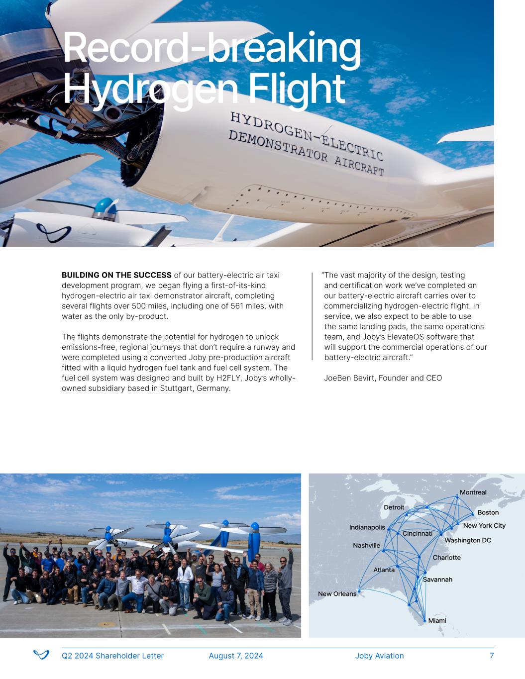 Joby AviationQ2 2024 Shareholder Letter August 7, 2024 7 Record-breaking Hydrogen Flight BUILDING ON THE SUCCESS of our battery-electric air taxi development program, we began flying a first-of-its-kind hydrogen-electric air taxi demonstrator aircraft, completing several flights over 500 miles, including one of 561 miles, with water as the only by-product. The flights demonstrate the potential for hydrogen to unlock emissions-free, regional journeys that don’t require a runway and were completed using a converted Joby pre-production aircraft fitted with a liquid hydrogen fuel tank and fuel cell system. The fuel cell system was designed and built by H2FLY, Joby’s wholly- owned subsidiary based in Stuttgart, Germany. “The vast majority of the design, testing and certification work we’ve completed on our battery-electric aircraft carries over to commercializing hydrogen-electric flight. In service, we also expect to be able to use the same landing pads, the same operations team, and Joby’s ElevateOS software that will support the commercial operations of our battery-electric aircraft.” JoeBen Bevirt, Founder and CEO