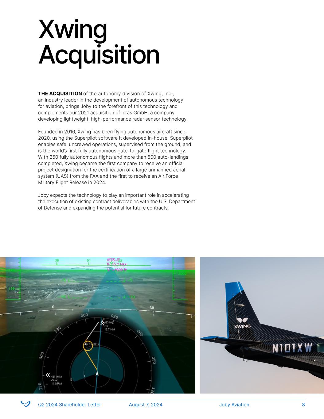 Xwing Acquisition Joby AviationQ2 2024 Shareholder Letter August 7, 2024 8 THE ACQUISITION of the autonomy division of Xwing, Inc., an industry leader in the development of autonomous technology for aviation, brings Joby to the forefront of this technology and complements our 2021 acquisition of Inras GmbH, a company developing lightweight, high-performance radar sensor technology. Founded in 2016, Xwing has been flying autonomous aircraft since 2020, using the Superpilot software it developed in-house. Superpilot enables safe, uncrewed operations, supervised from the ground, and is the world’s first fully autonomous gate-to-gate flight technology. With 250 fully autonomous flights and more than 500 auto-landings completed, Xwing became the first company to receive an official project designation for the certification of a large unmanned aerial system (UAS) from the FAA and the first to receive an Air Force Military Flight Release in 2024. Joby expects the technology to play an important role in accelerating the execution of existing contract deliverables with the U.S. Department of Defense and expanding the potential for future contracts.