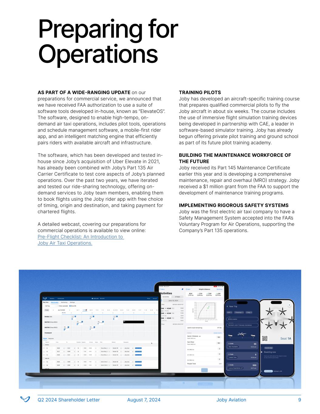 AS PART OF A WIDE-RANGING UPDATE on our preparations for commercial service, we announced that we have received FAA authorization to use a suite of software tools developed in-house, known as “ElevateOS”. The software, designed to enable high-tempo, on- demand air taxi operations, includes pilot tools, operations and schedule management software, a mobile-first rider app, and an intelligent matching engine that efficiently pairs riders with available aircraft and infrastructure. The software, which has been developed and tested in- house since Joby’s acquisition of Uber Elevate in 2021, has already been combined with Joby’s Part 135 Air Carrier Certificate to test core aspects of Joby’s planned operations. Over the past two years, we have iterated and tested our ride-sharing technology, offering on- demand services to Joby team members, enabling them to book flights using the Joby rider app with free choice of timing, origin and destination, and taking payment for chartered flights. A detailed webcast, covering our preparations for commercial operations is available to view online: Pre-Flight Checklist: An Introduction to Joby Air Taxi Operations. Preparing for Operations Joby AviationQ2 2024 Shareholder Letter August 7, 2024 9 TRAINING PILOTS Joby has developed an aircraft-specific training course that prepares qualified commercial pilots to fly the Joby aircraft in about six weeks. The course includes the use of immersive flight simulation training devices being developed in partnership with CAE, a leader in software-based simulator training. Joby has already begun offering private pilot training and ground school as part of its future pilot training academy. BUILDING THE MAINTENANCE WORKFORCE OF THE FUTURE Joby received its Part 145 Maintenance Certificate earlier this year and is developing a comprehensive maintenance, repair and overhaul (MRO) strategy. Joby received a $1 million grant from the FAA to support the development of maintenance training programs. IMPLEMENTING RIGOROUS SAFETY SYSTEMS Joby was the first electric air taxi company to have a Safety Management System accepted into the FAA’s Voluntary Program for Air Operations, supporting the Company’s Part 135 operations.