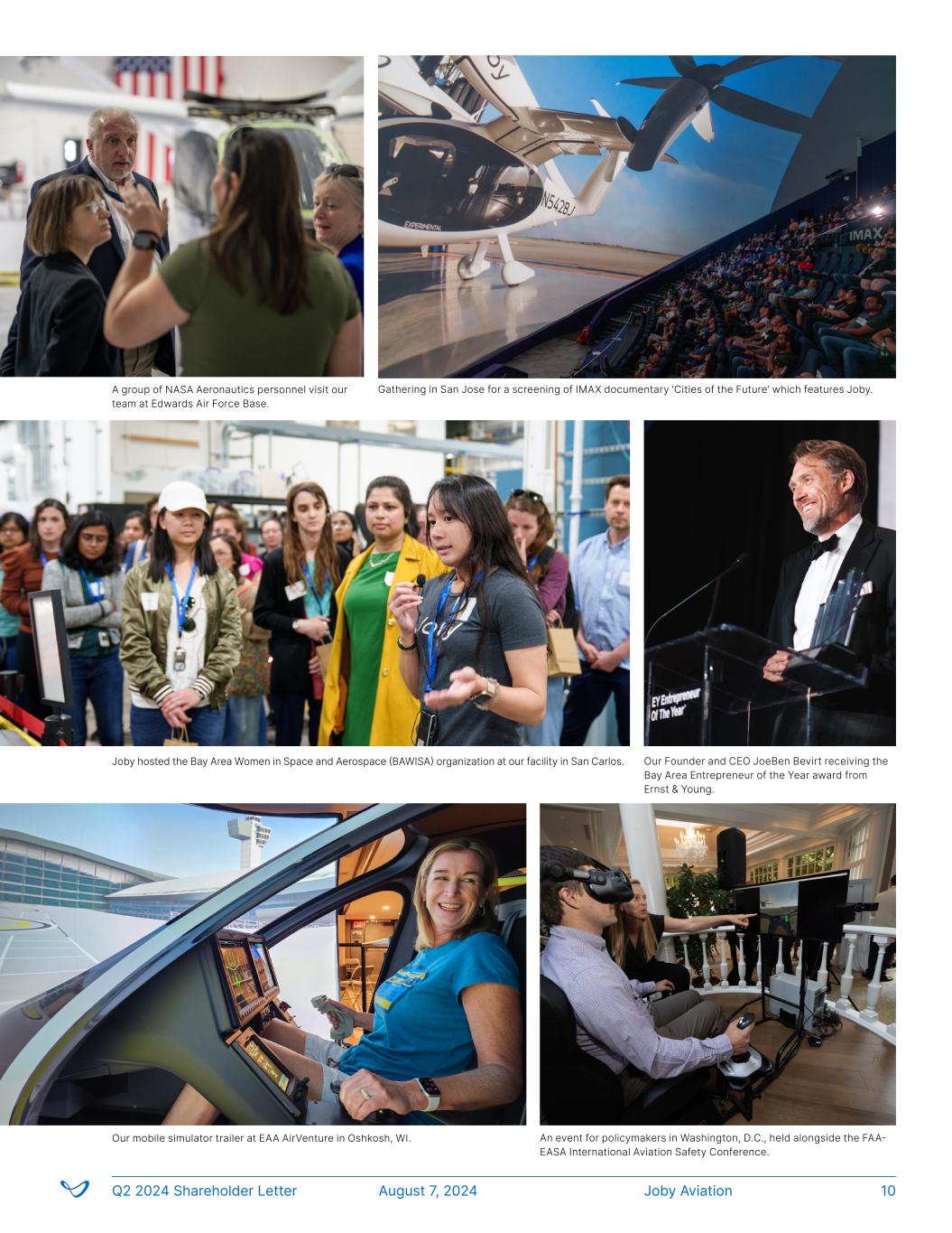 An event for policymakers in Washington, D.C., held alongside the FAA- EASA International Aviation Safety Conference. Our Founder and CEO JoeBen Bevirt receiving the Bay Area Entrepreneur of the Year award from Ernst & Young. Gathering in San Jose for a screening of IMAX documentary ‘Cities of the Future’ which features Joby.A group of NASA Aeronautics personnel visit our team at Edwards Air Force Base. Joby hosted the Bay Area Women in Space and Aerospace (BAWISA) organization at our facility in San Carlos. Joby AviationQ2 2024 Shareholder Letter August 7, 2024 10 Our mobile simulator trailer at EAA AirVenture in Oshkosh, WI.