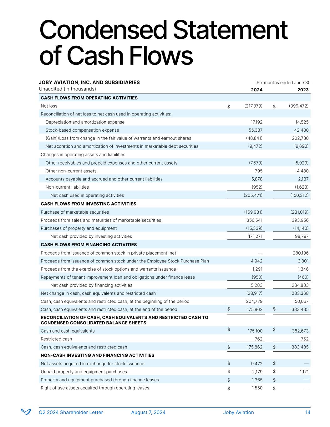 Condensed Statement of Cash Flows JOBY AVIATION, INC. AND SUBSIDIARIES Unaudited (in thousands) 2024 2023 CASH FLOWS FROM OPERATING ACTIVITIES Net loss (217,879) (399,472) Reconciliation of net loss to net cash used in operating activities: Depreciation and amortization expense 17,192 14,525 Stock-based compensation expense 55,387 42,480 (Gain)/Loss from change in the fair value of warrants and earnout shares (48,841) 202,780 Net accretion and amortization of investments in marketable debt securities (9,472) (9,690) Changes in operating assets and liabilities Other receivables and prepaid expenses and other current assets (7,579) (5,929) Other non-current assets 795 4,480 Accounts payable and accrued and other current liabilities 5,878 2,137 Non-current liabilities (952) (1,623) Net cash used in operating activities (205,471) (150,312) CASH FLOWS FROM INVESTING ACTIVITIES Purchase of marketable securities (169,931) (281,019) Proceeds from sales and maturities of marketable securities 356,541 393,956 Purchases of property and equipment (15,339) (14,140) Net cash provided by investing activities 171,271 98,797 CASH FLOWS FROM FINANCING ACTIVITIES Proceeds from issuance of common stock in private placement, net — 280,196 Proceeds from issuance of common stock under the Employee Stock Purchase Plan 4,942 3,801 Proceeds from the exercise of stock options and warrants issuance 1,291 1,346 Repayments of tenant improvement loan and obligations under finance lease (950) (460) Net cash provided by financing activities 5,283 284,883 Net change in cash, cash equivalents and restricted cash (28,917) 233,368 Cash, cash equivalents and restricted cash, at the beginning of the period 204,779 150,067 Cash, cash equivalents and restricted cash, at the end of the period 175,862 383,435 RECONCILIATION OF CASH, CASH EQUIVALENTS AND RESTRICTED CASH TO CONDENSED CONSOLIDATED BALANCE SHEETS Cash and cash equivalents 175,100 382,673 Restricted cash 762 762 Cash, cash equivalents and restricted cash 175,862 383,435 NON-CASH INVESTING AND FINANCING ACTIVITIES Net assets acquired in exchange for stock issuance 9,472 — Unpaid property and equipment purchases 2,179 1,171 Property and equipment purchased through finance leases 1,365 — Right of use assets acquired through operating leases 1,550 — $ $ $ $ $ $ $ $ $ $ Six months ended June 30 Joby AviationQ2 2024 Shareholder Letter August 7, 2024 14 $ $ $ $ $ $
