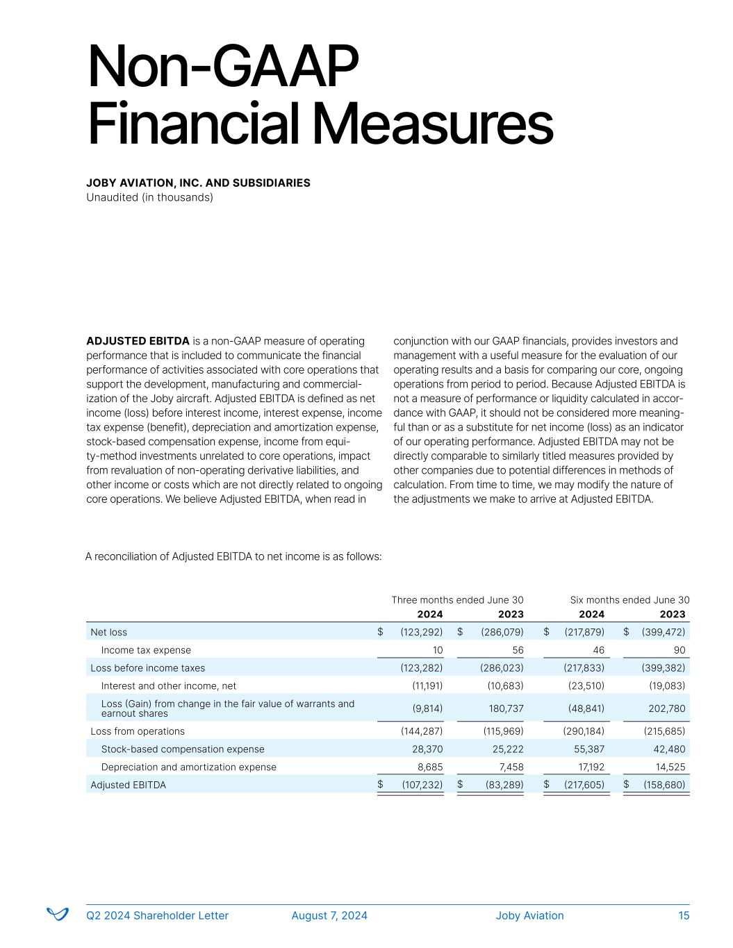 Non-GAAP Financial Measures ADJUSTED EBITDA is a non-GAAP measure of operating performance that is included to communicate the financial performance of activities associated with core operations that support the development, manufacturing and commercial- ization of the Joby aircraft. Adjusted EBITDA is defined as net income (loss) before interest income, interest expense, income tax expense (benefit), depreciation and amortization expense, stock-based compensation expense, income from equi- ty-method investments unrelated to core operations, impact from revaluation of non-operating derivative liabilities, and other income or costs which are not directly related to ongoing core operations. We believe Adjusted EBITDA, when read in conjunction with our GAAP financials, provides investors and management with a useful measure for the evaluation of our operating results and a basis for comparing our core, ongoing operations from period to period. Because Adjusted EBITDA is not a measure of performance or liquidity calculated in accor- dance with GAAP, it should not be considered more meaning- ful than or as a substitute for net income (loss) as an indicator of our operating performance. Adjusted EBITDA may not be directly comparable to similarly titled measures provided by other companies due to potential differences in methods of calculation. From time to time, we may modify the nature of the adjustments we make to arrive at Adjusted EBITDA. A reconciliation of Adjusted EBITDA to net income is as follows: JOBY AVIATION, INC. AND SUBSIDIARIES Unaudited (in thousands) 2024 2023 2024 2023 Net loss (123,292) (286,079) (217,879) (399,472) Income tax expense 10 56 46 90 Loss before income taxes (123,282) (286,023) (217,833) (399,382) Interest and other income, net (11,191) (10,683) (23,510) (19,083) Loss (Gain) from change in the fair value of warrants and earnout shares (9,814) 180,737 (48,841) 202,780 Loss from operations (144,287) (115,969) (290,184) (215,685) Stock-based compensation expense 28,370 25,222 55,387 42,480 Depreciation and amortization expense 8,685 7,458 17,192 14,525 Adjusted EBITDA (107,232) (83,289) (217,605) (158,680) Three months ended June 30 Six months ended June 30 $ $$ $ $ $$ $ Joby AviationQ2 2024 Shareholder Letter August 7, 2024 15