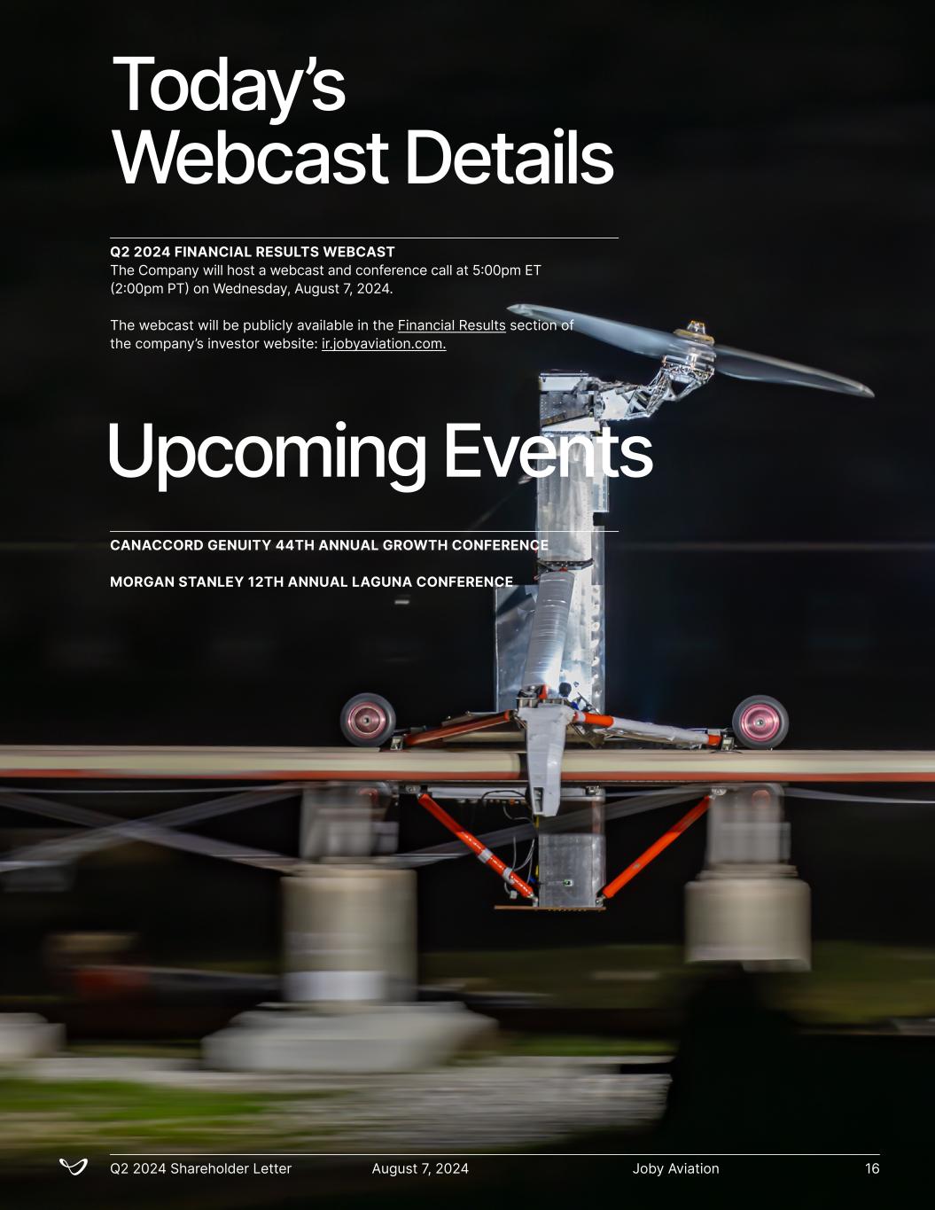 Upcoming Events Today’s Webcast Details Q2 2024 FINANCIAL RESULTS WEBCAST The Company will host a webcast and conference call at 5:00pm ET (2:00pm PT) on Wednesday, August 7, 2024. The webcast will be publicly available in the Financial Results section of the company’s investor website: ir.jobyaviation.com. CANACCORD GENUITY 44TH ANNUAL GROWTH CONFERENCE MORGAN STANLEY 12TH ANNUAL LAGUNA CONFERENCE Joby AviationQ2 2024 Shareholder Letter August 7, 2024 16