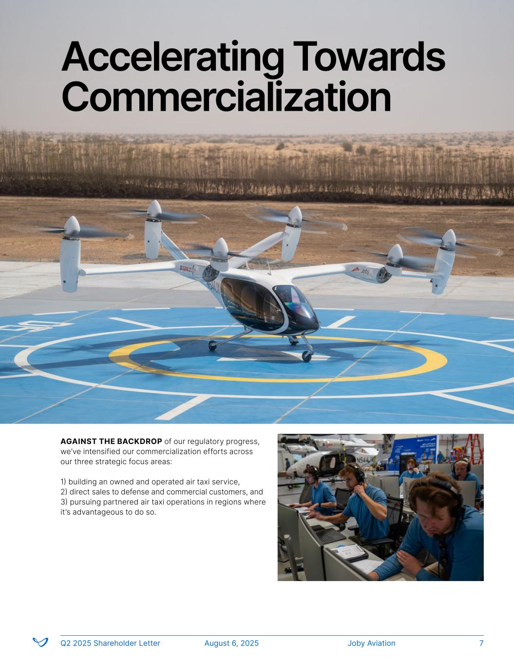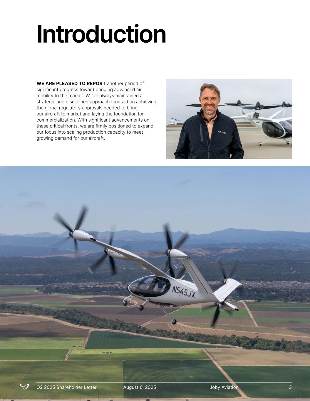 Introduction Joby AviationQ2 2025 Shareholder Letter August 6, 2025 3 WE ARE PLEASED TO REPORT another period of significant progress toward bringing advanced air mobility to the market. We've always maintained a strategic and disciplined approach focused on achieving the global regulatory approvals needed to bring our aircraft to market and laying the foundation for commercialization. With significant advancements on these critical fronts, we are firmly positioned to expand our focus into scaling production capacity to meet growing demand for our aircraft.