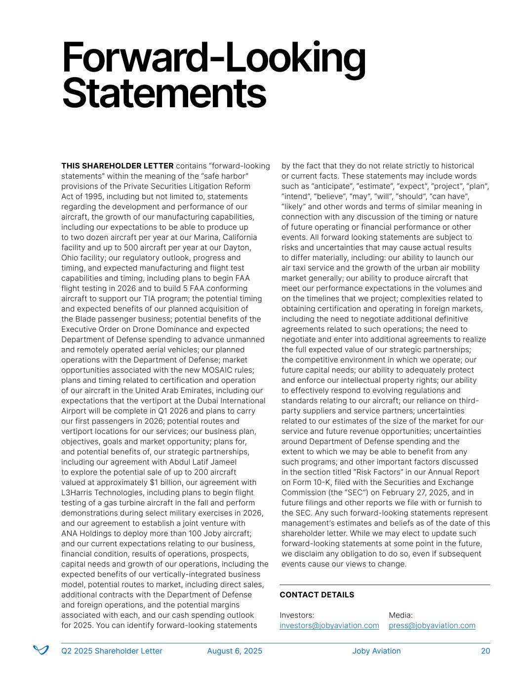THIS SHAREHOLDER LETTER contains “forward-looking statements” within the meaning of the “safe harbor” provisions of the Private Securities Litigation Reform Act of 1995, including but not limited to, statements regarding the development and performance of our aircraft, the growth of our manufacturing capabilities, including our expectations to be able to produce up to two dozen aircraft per year at our Marina, California facility and up to 500 aircraft per year at our Dayton, Ohio facility; our regulatory outlook, progress and timing, and expected manufacturing and flight test capabilities and timing, including plans to begin FAA flight testing in 2026 and to build 5 FAA conforming aircraft to support our TIA program; the potential timing and expected benefits of our planned acquisition of the Blade passenger business; potential benefits of the Executive Order on Drone Dominance and expected Department of Defense spending to advance unmanned and remotely operated aerial vehicles; our planned operations with the Department of Defense; market opportunities associated with the new MOSAIC rules; plans and timing related to certification and operation of our aircraft in the United Arab Emirates, including our expectations that the vertiport at the Dubai International Airport will be complete in Q1 2026 and plans to carry our first passengers in 2026; potential routes and vertiport locations for our services; our business plan, objectives, goals and market opportunity; plans for, and potential benefits of, our strategic partnerships, including our agreement with Abdul Latif Jameel to explore the potential sale of up to 200 aircraft valued at approximately $1 billion, our agreement with L3Harris Technologies, including plans to begin flight testing of a gas turbine aircraft in the fall and perform demonstrations during select military exercises in 2026, and our agreement to establish a joint venture with ANA Holdings to deploy more than 100 Joby aircraft; and our current expectations relating to our business, financial condition, results of operations, prospects, capital needs and growth of our operations, including the expected benefits of our vertically-integrated business model, potential routes to market, including direct sales, additional contracts with the Department of Defense and foreign operations, and the potential margins associated with each, and our cash spending outlook for 2025. You can identify forward-looking statements by the fact that they do not relate strictly to historical or current facts. These statements may include words such as “anticipate”, “estimate”, “expect”, “project”, “plan”, “intend”, “believe”, “may”, “will”, “should”, “can have”, “likely” and other words and terms of similar meaning in connection with any discussion of the timing or nature of future operating or financial performance or other events. All forward looking statements are subject to risks and uncertainties that may cause actual results to differ materially, including: our ability to launch our air taxi service and the growth of the urban air mobility market generally; our ability to produce aircraft that meet our performance expectations in the volumes and on the timelines that we project; complexities related to obtaining certification and operating in foreign markets, including the need to negotiate additional definitive agreements related to such operations; the need to negotiate and enter into additional agreements to realize the full expected value of our strategic partnerships; the competitive environment in which we operate; our future capital needs; our ability to adequately protect and enforce our intellectual property rights; our ability to effectively respond to evolving regulations and standards relating to our aircraft; our reliance on third- party suppliers and service partners; uncertainties related to our estimates of the size of the market for our service and future revenue opportunities; uncertainties around Department of Defense spending and the extent to which we may be able to benefit from any such programs; and other important factors discussed in the section titled “Risk Factors” in our Annual Report on Form 10-K, filed with the Securities and Exchange Commission (the “SEC”) on February 27, 2025, and in future filings and other reports we file with or furnish to the SEC. Any such forward-looking statements represent management’s estimates and beliefs as of the date of this shareholder letter. While we may elect to update such forward-looking statements at some point in the future, we disclaim any obligation to do so, even if subsequent events cause our views to change. Forward-Looking Statements CONTACT DETAILS Investors: investors@jobyaviation.com Media: press@jobyaviation.com Joby AviationQ2 2025 Shareholder Letter August 6, 2025 20