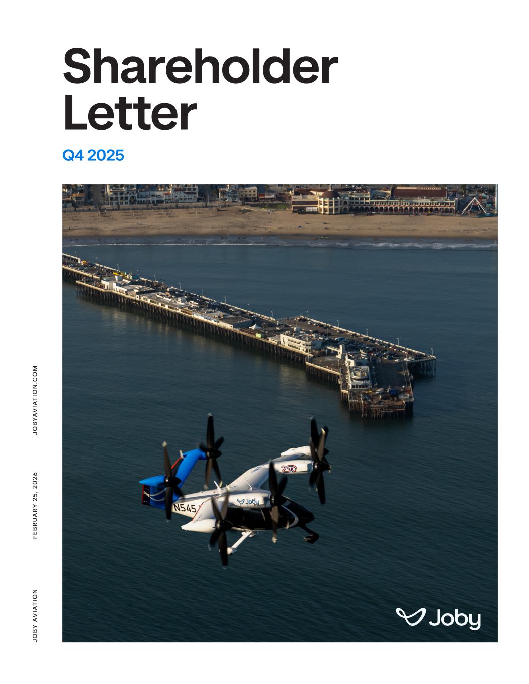 THIS SHAREHOLDER LETTER contains “forward- looking statements” within the meaning of the “safe harbor” provisions of the Private Securities Litigation Reform Act of 1995, including but not limited to, statements regarding the development and performance of our aircraft, the growth of our manufacturing capabilities, including our plans to acquire an additional manufacturing facility near Dayton, OH and to begin operations at the facility this year; plans to double production to four aircraft per month in 2027; our regulatory outlook, progress and timing, including our expectation to begin “for credit” flight testing with FAA pilots and to carry our first passengers in 2026; planned operations with the Department of Defense; our business plan, objectives, goals, market opportunity and expected demand for our aircraft and services; plans for, and potential benefits of, our strategic partnerships, including the integration of our Blade service into the Uber app, our strategic manufacturing alliance with Toyota, and plans for operational demonstrations this year in connection with our partnership with L3Harris; expected opportunities under the eIPP for pre-type certification operations; plans and timing related to the certification and operation of our aircraft in the United Arab Emirates, including expected vertiport locations; plans for pre- commercial operations in Saudi Arabia; the potential for sales of up to $250 million in aircraft and services in Kazakhstan and up to $1 billion of aircraft and services in other locations; plans for vertiport development in the U.S.; expected benefits of potential upgrades to the air traffic control system in the U.S.; plans to participate in, and goals of, the Tokyo Metropolitan Government’s project to make commercial electric air taxi service a reality by 2030; potential applications for use of our hybrid turbine powertrain and expected timing and potential benefits of autonomous capabilities; and our current expectations relating to our business, financial condition, results of operations, prospects, capital needs and growth of our operations, including the sufficiency of our existing capital to deliver on plans for scaling production, expected benefits of our vertically-integrated business model and our use of cash and revenue guidance for 2026. You can identify forward-looking statements by the fact that they do not relate strictly to historical or current facts. These statements may include words such as “anticipate”, “estimate”, “expect”, “project”, “plan”, “intend”, “believe”, “may”, “will”, “should”, “can have”, “likely” and other words and terms of similar meaning in connection with any discussion of the timing or nature of future operating or financial performance or other events. All forward-looking statements are subject to risks and uncertainties that may cause actual results to differ materially, including: our ability to launch our air taxi service and the growth of the urban air mobility market generally; our ability to produce aircraft that meet our performance expectations in the volumes and on the timelines that we project; complexities related to obtaining certification and operating in foreign markets; the ability to secure additional contracts with U.S. government agencies cannot be guaranteed; uncertainties around Department of Defense spending and the extent to which we may benefit from such programs; the need to negotiate additional definitive agreements to achieve the full expected value of our partnerships, international operations and potential sales of our aircraft and services; the competitive environment in which we operate; our future capital needs; our ability to adequately protect and enforce our intellectual property rights; our ability to effectively respond to evolving regulations and standards relating to our aircraft; uncertainty around timing of proposed enhancements to the air traffic control system; our reliance on third-party suppliers and service partners; uncertainties related to our estimates of the size of the market for our service and future revenue opportunities; and other important factors discussed in the section titled “Risk Factors” in our Annual Report on Form 10-K, filed with the Securities and Exchange Commission (the “SEC”) on February 27, 2025, our Quarterly Reports on Form 10-Q filed with the SEC on May 8, 2025, August 7, 2025 and November 6, 2025, and in future filings and other reports we file with or furnish to the SEC. Any such forward-looking statements represent management’s estimates and beliefs as of the date of this shareholder letter. While we may elect to update such forward-looking statements at some point in the future, we disclaim any obligation to do so, even if subsequent events cause our views to change. Forward-Looking Statements CONTACT DETAILS Investors: investors@jobyaviation.com Media: press@jobyaviation.com Joby AviationQ4 2025 Shareholder Letter February 25, 2026 17