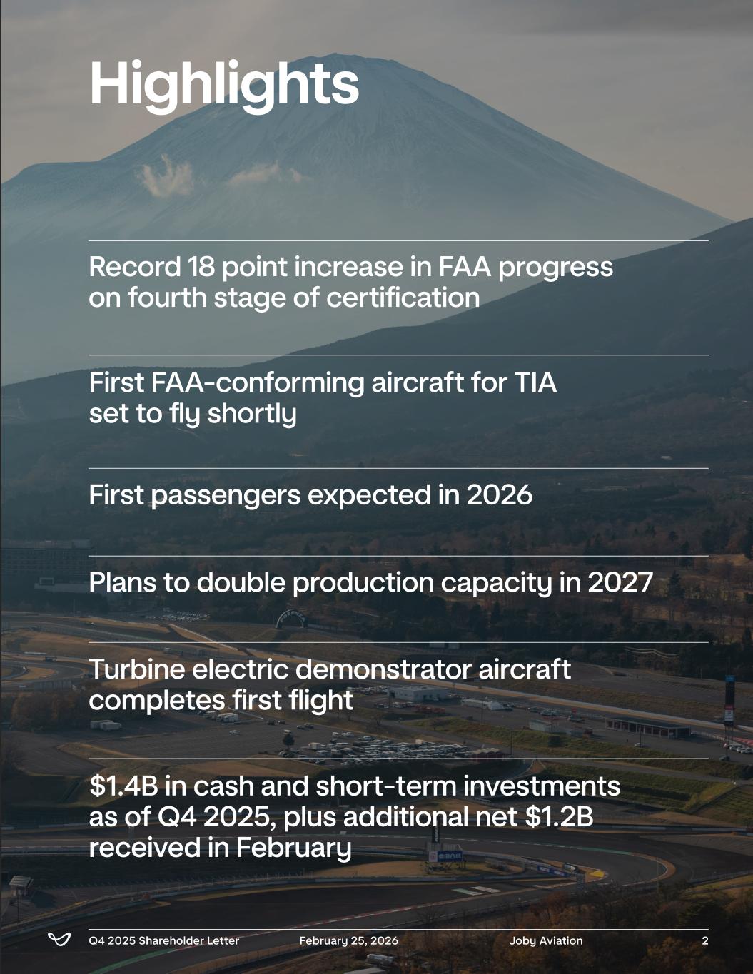 Highlights Turbine electric demonstrator aircraft completes first flight First FAA-conforming aircraft for TIA set to fly shortly $1.4B in cash and short-term investments as of Q4 2025, plus additional net $1.2B received in February First passengers expected in 2026 Record 18 point increase in FAA progress on fourth stage of certification Plans to double production capacity in 2027 Joby AviationQ4 2025 Shareholder Letter February 25, 2026 2