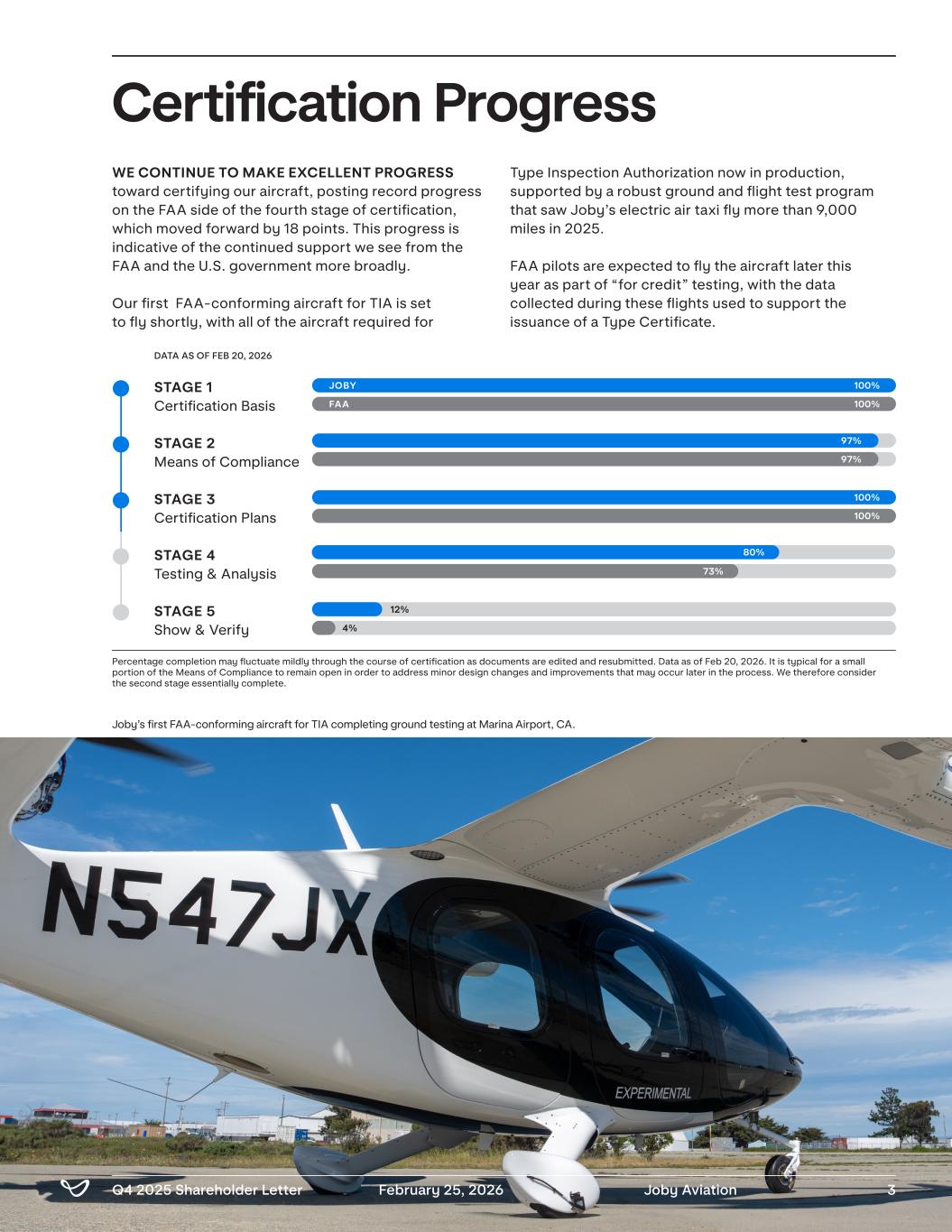 Percentage completion may fluctuate mildly through the course of certification as documents are edited and resubmitted. Data as of Feb 20, 2026. It is typical for a small portion of the Means of Compliance to remain open in order to address minor design changes and improvements that may occur later in the process. We therefore consider the second stage essentially complete. WE CONTINUE TO MAKE EXCELLENT PROGRESS toward certifying our aircraft, posting record progress on the FAA side of the fourth stage of certification, which moved forward by 18 points. This progress is indicative of the continued support we see from the FAA and the U.S. government more broadly. Our first FAA-conforming aircraft for TIA is set to fly shortly, with all of the aircraft required for Type Inspection Authorization now in production, supported by a robust ground and flight test program that saw Joby’s electric air taxi fly more than 9,000 miles in 2025. FAA pilots are expected to fly the aircraft later this year as part of “for credit” testing, with the data collected during these flights used to support the issuance of a Type Certificate. DATA AS OF FEB 20, 2026 STAGE 1 Certification Basis STAGE 2 Means of Compliance STAGE 3 Certification Plans STAGE 4 Testing & Analysis STAGE 5 Show & Verify JOBY 100% 97% 80% 12% FAA 100% 97% 73% 4% 100% 100% Certification Progress Joby AviationQ4 2025 Shareholder Letter February 25, 2026 3 Joby’s first FAA-conforming aircraft for TIA completing ground testing at Marina Airport, CA.