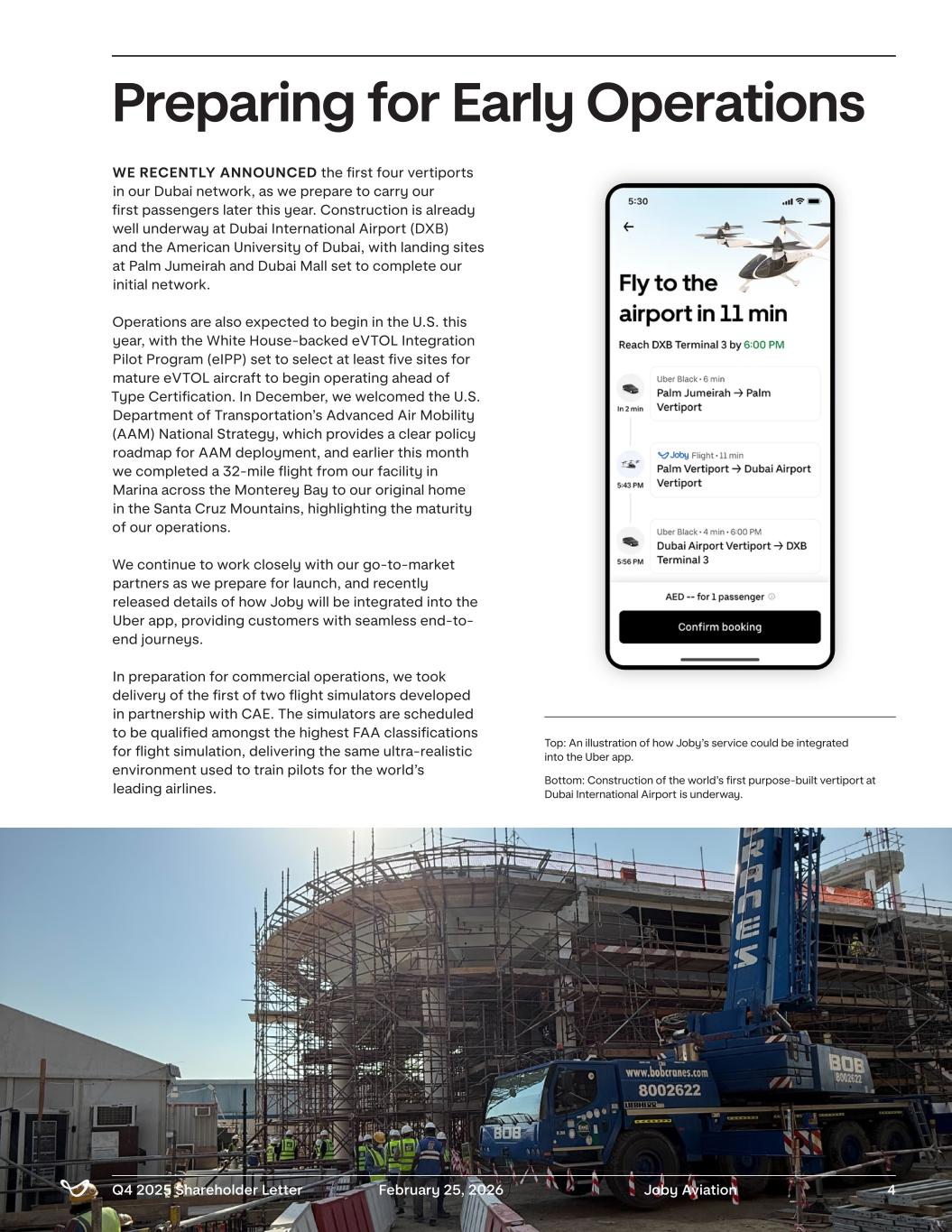 WE RECENTLY ANNOUNCED the first four vertiports in our Dubai network, as we prepare to carry our first passengers later this year. Construction is already well underway at Dubai International Airport (DXB) and the American University of Dubai, with landing sites at Palm Jumeirah and Dubai Mall set to complete our initial network. Operations are also expected to begin in the U.S. this year, with the White House-backed eVTOL Integration Pilot Program (eIPP) set to select at least five sites for mature eVTOL aircraft to begin operating ahead of Type Certification. In December, we welcomed the U.S. Department of Transportation’s Advanced Air Mobility (AAM) National Strategy, which provides a clear policy roadmap for AAM deployment, and earlier this month we completed a 32-mile flight from our facility in Marina across the Monterey Bay to our original home in the Santa Cruz Mountains, highlighting the maturity of our operations. We continue to work closely with our go-to-market partners as we prepare for launch, and recently released details of how Joby will be integrated into the Uber app, providing customers with seamless end-to- end journeys. In preparation for commercial operations, we took delivery of the first of two flight simulators developed in partnership with CAE. The simulators are scheduled to be qualified amongst the highest FAA classifications for flight simulation, delivering the same ultra-realistic environment used to train pilots for the world’s leading airlines. Preparing for Early Operations Joby AviationQ4 2025 Shareholder Letter February 25, 2026 4 Top: An illustration of how Joby’s service could be integrated into the Uber app. Bottom: Construction of the world’s first purpose-built vertiport at Dubai International Airport is underway.