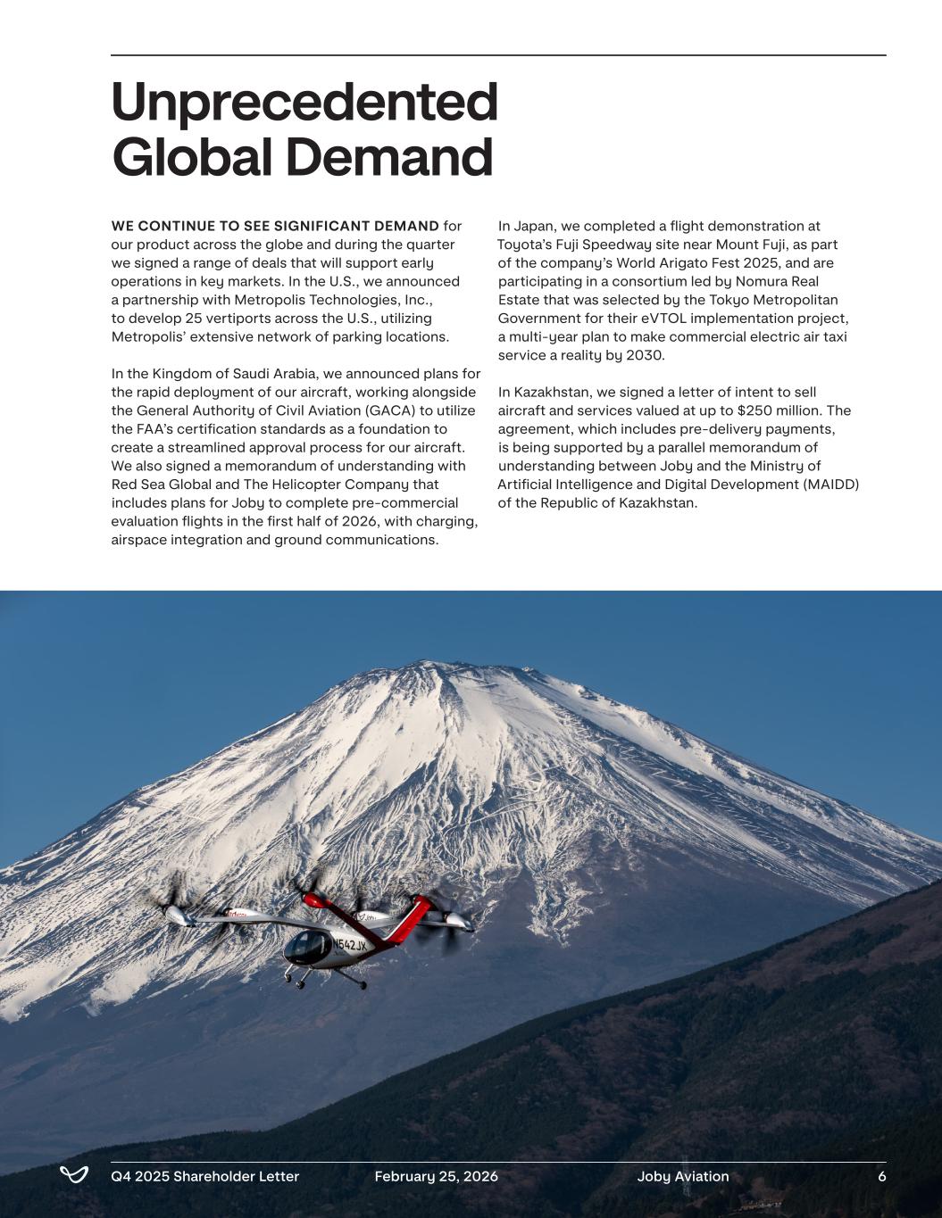 WE CONTINUE TO SEE SIGNIFICANT DEMAND for our product across the globe and during the quarter we signed a range of deals that will support early operations in key markets. In the U.S., we announced a partnership with Metropolis Technologies, Inc., to develop 25 vertiports across the U.S., utilizing Metropolis’ extensive network of parking locations. In the Kingdom of Saudi Arabia, we announced plans for the rapid deployment of our aircraft, working alongside the General Authority of Civil Aviation (GACA) to utilize the FAA’s certification standards as a foundation to create a streamlined approval process for our aircraft. We also signed a memorandum of understanding with Red Sea Global and The Helicopter Company that includes plans for Joby to complete pre-commercial evaluation flights in the first half of 2026, with charging, airspace integration and ground communications. In Japan, we completed a flight demonstration at Toyota’s Fuji Speedway site near Mount Fuji, as part of the company’s World Arigato Fest 2025, and are participating in a consortium led by Nomura Real Estate that was selected by the Tokyo Metropolitan Government for their eVTOL implementation project, a multi-year plan to make commercial electric air taxi service a reality by 2030. In Kazakhstan, we signed a letter of intent to sell aircraft and services valued at up to $250 million. The agreement, which includes pre-delivery payments, is being supported by a parallel memorandum of understanding between Joby and the Ministry of Artificial Intelligence and Digital Development (MAIDD) of the Republic of Kazakhstan. Unprecedented Global Demand Joby AviationQ4 2025 Shareholder Letter February 25, 2026 6