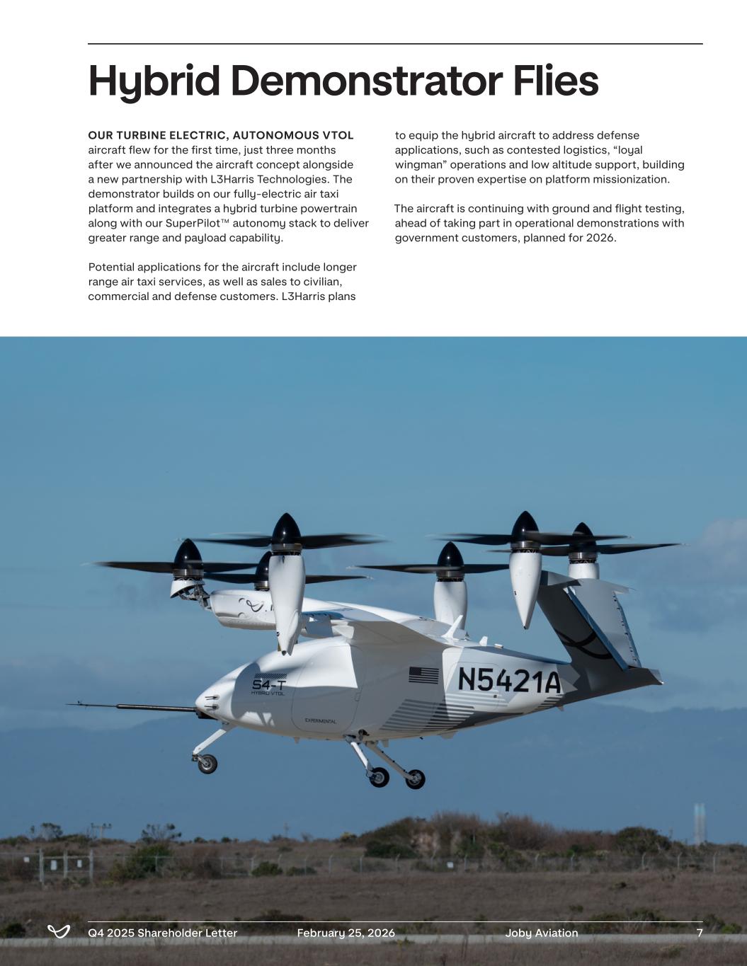 OUR TURBINE ELECTRIC, AUTONOMOUS VTOL aircraft flew for the first time, just three months after we announced the aircraft concept alongside a new partnership with L3Harris Technologies. The demonstrator builds on our fully-electric air taxi platform and integrates a hybrid turbine powertrain along with our SuperPilot™ autonomy stack to deliver greater range and payload capability. Potential applications for the aircraft include longer range air taxi services, as well as sales to civilian, commercial and defense customers. L3Harris plans to equip the hybrid aircraft to address defense applications, such as contested logistics, “loyal wingman” operations and low altitude support, building on their proven expertise on platform missionization. The aircraft is continuing with ground and flight testing, ahead of taking part in operational demonstrations with government customers, planned for 2026. Hybrid Demonstrator Flies Joby AviationQ4 2025 Shareholder Letter February 25, 2026 7