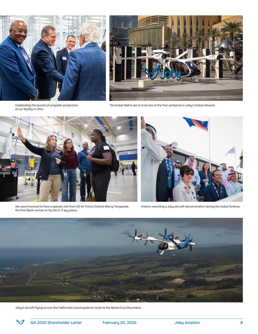Celebrating the launch of propeller production at our facility in Ohio. The Dubai Mall is set to host one of the first vertiports in Joby’s Dubai network. Joby’s aircraft flying across the Californian countryside en route to the Santa Cruz Mountains. We were honored to have a special visit from US Air Force Colonel Merryl Tengesdal, the first Black woman to fly the U-2 spy plane. Visitors watching a Joby aircraft demonstration during the Dubai Airshow. Joby AviationQ4 2025 Shareholder Letter February 25, 2026 8