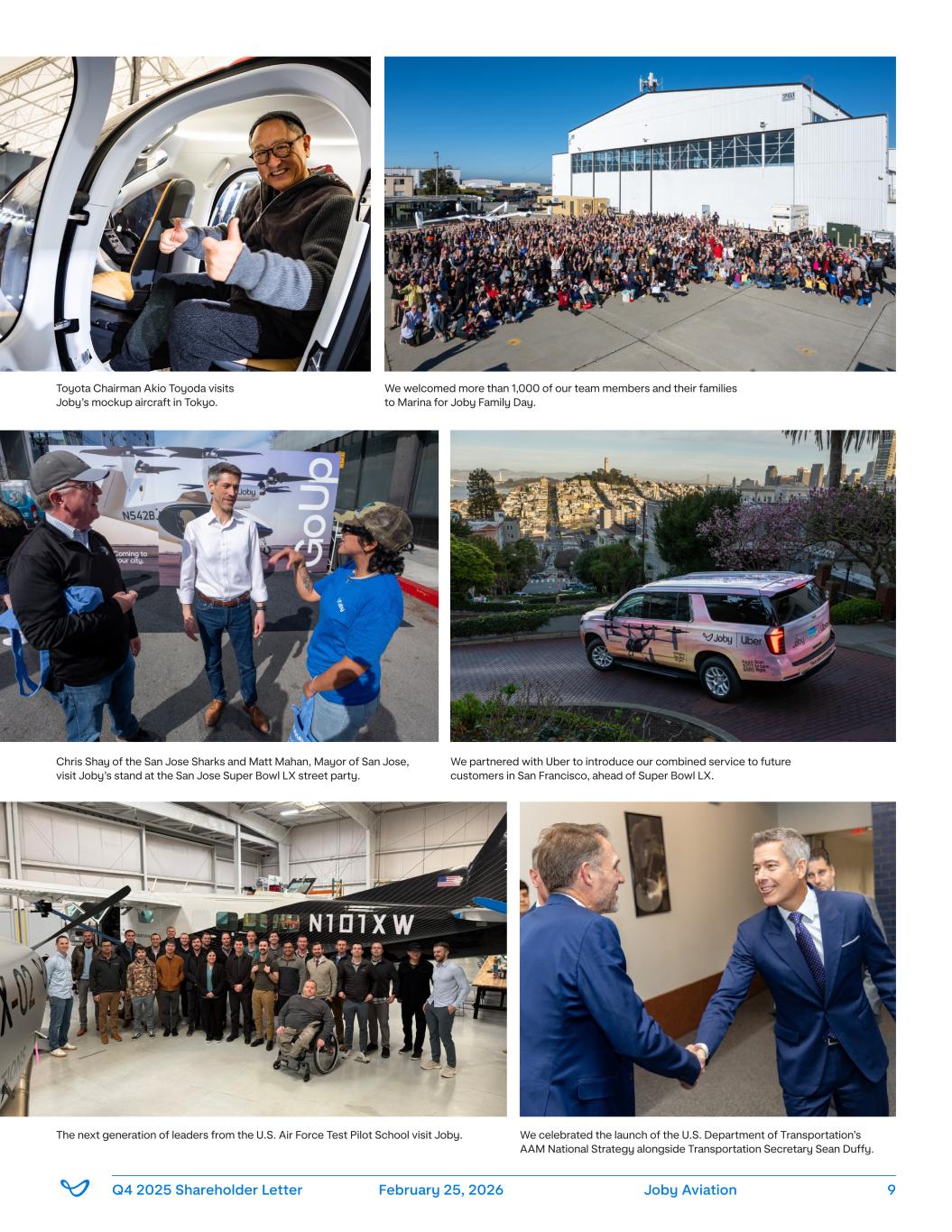 Chris Shay of the San Jose Sharks and Matt Mahan, Mayor of San Jose, visit Joby’s stand at the San Jose Super Bowl LX street party. We partnered with Uber to introduce our combined service to future customers in San Francisco, ahead of Super Bowl LX. We welcomed more than 1,000 of our team members and their families to Marina for Joby Family Day. Toyota Chairman Akio Toyoda visits Joby’s mockup aircraft in Tokyo. We celebrated the launch of the U.S. Department of Transportation’s AAM National Strategy alongside Transportation Secretary Sean Duffy. The next generation of leaders from the U.S. Air Force Test Pilot School visit Joby. Joby AviationQ4 2025 Shareholder Letter February 25, 2026 9